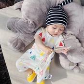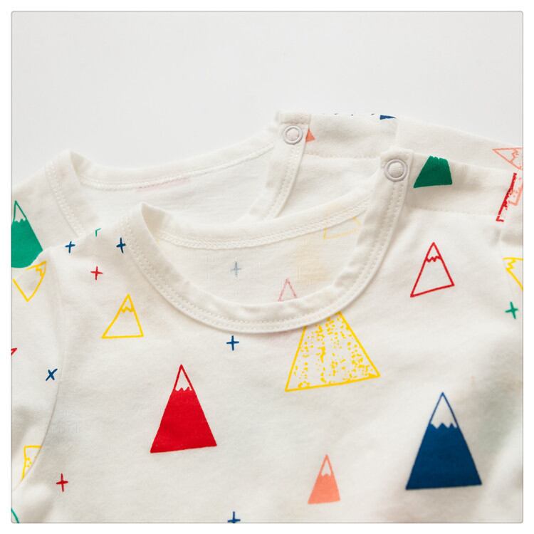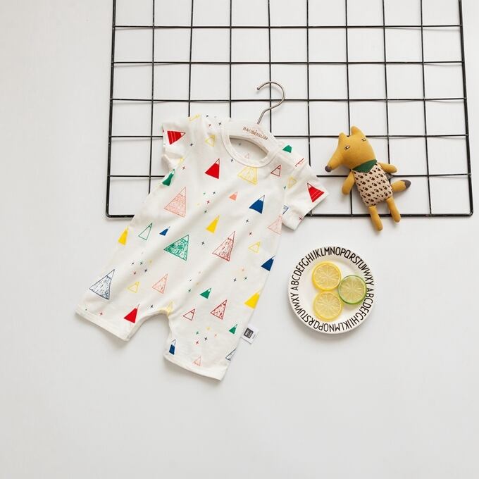 カラフルな手描き風のイラストが目を引くロンパースです。