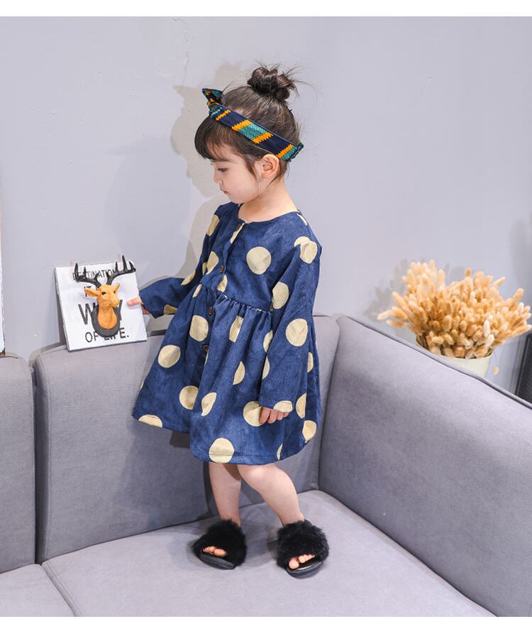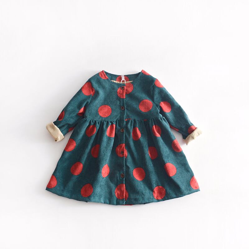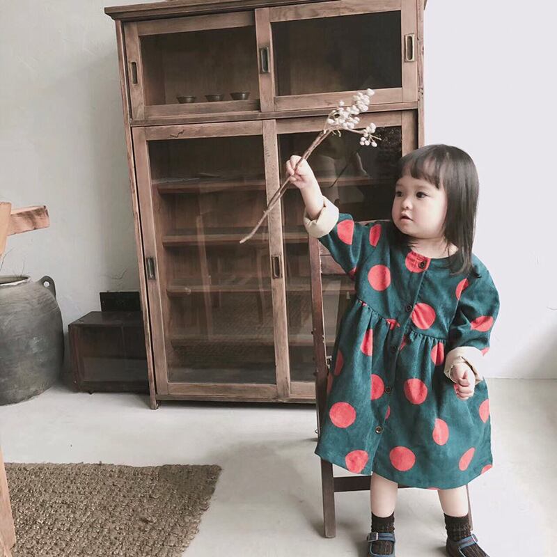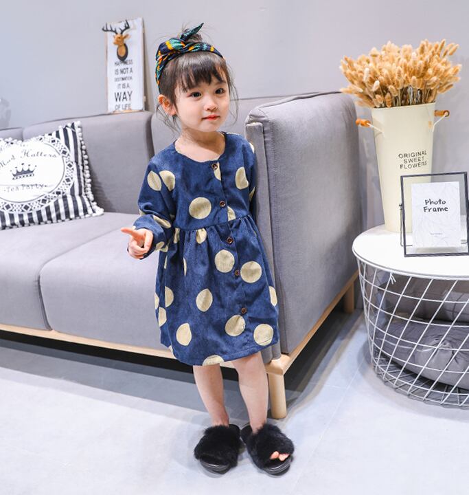 ワンピース コーデュロイ 女の子 ドット 長袖 秋冬 秋 冬 前開き 前ボタン 韓国 おしゃれ 可愛い