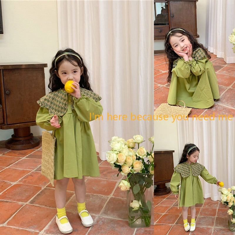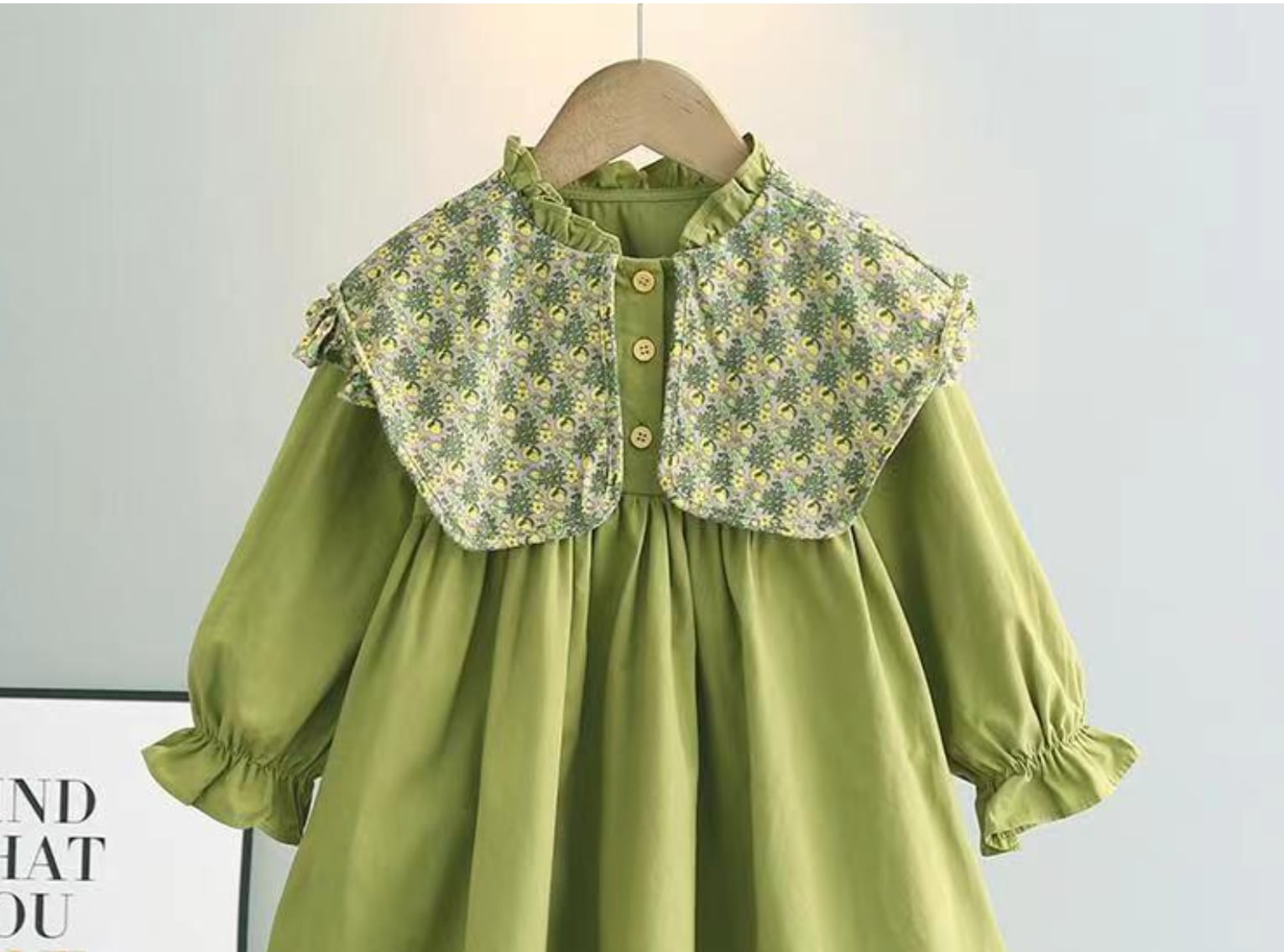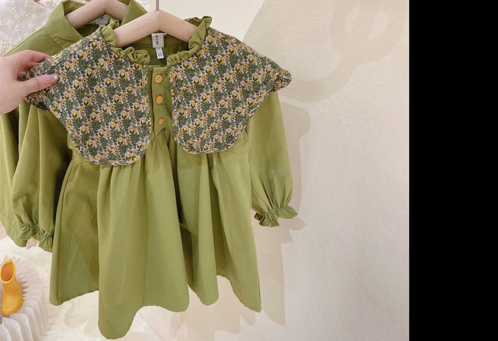 目を引く大きなフリル襟がポイントの、トレンド感あふれるワンピースが登場しました。 ナチュラルなライトグリーンのボディに、繊細な小花柄の襟を組み合わせた、どこかノスタルジックで可愛らしい一着です。