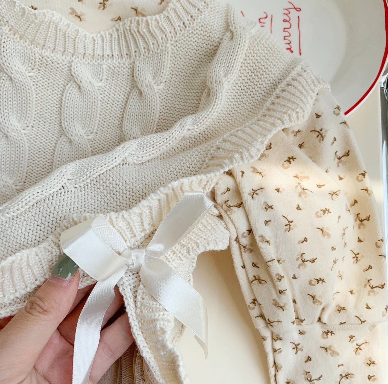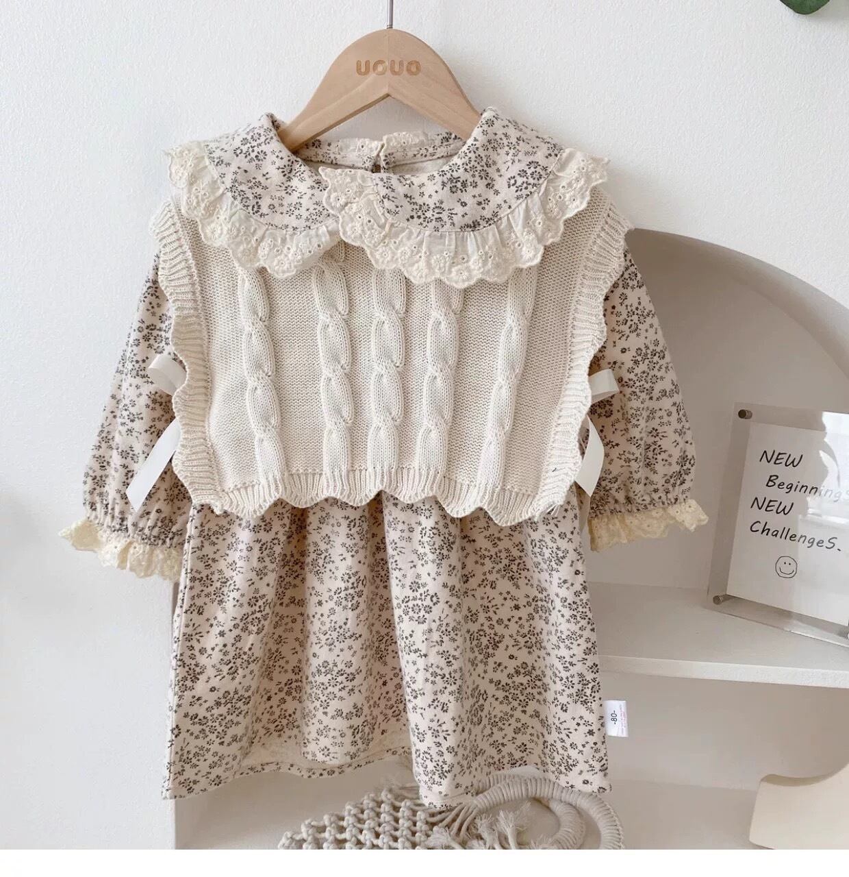 立体的なケーブル編みがクラシカルな雰囲気を演出しつつ、 サイドにあしらわれたリボンが女の子らしいアクセントに。横から見た時のシルエットがとっても可愛らしく、 「普通のベストじゃ物足りない!」というママのこだわりを叶えます。