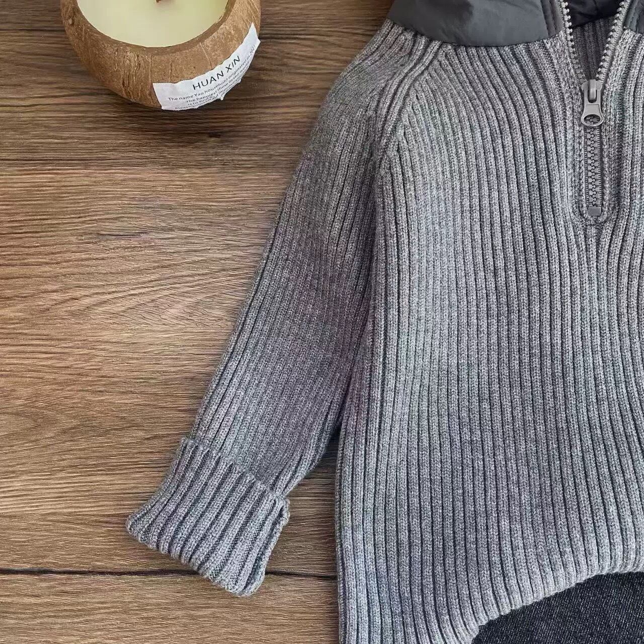 首元にはハーフジップを採用しており、異素材のコントラストが顔周りを華やかに演出します。シンプルながらも一癖あるデザインは、周りと差をつけたいおしゃれなキッズにぴったりの一着です。