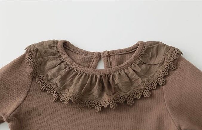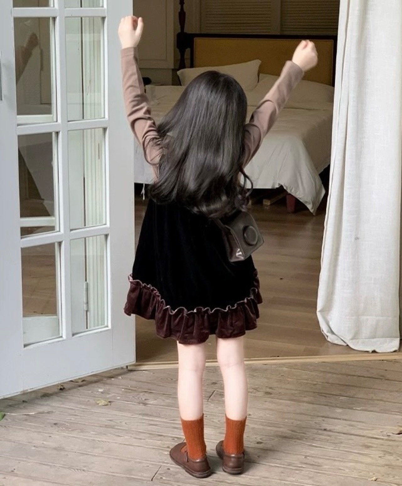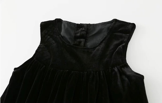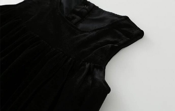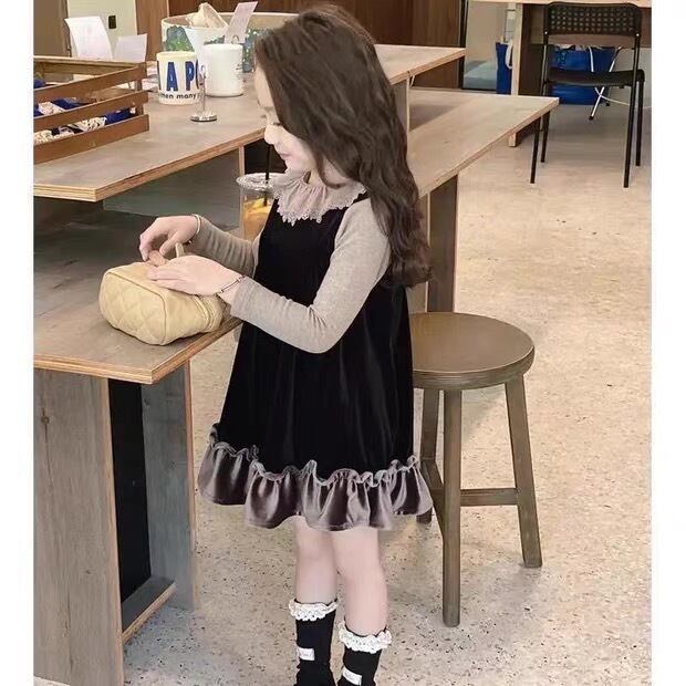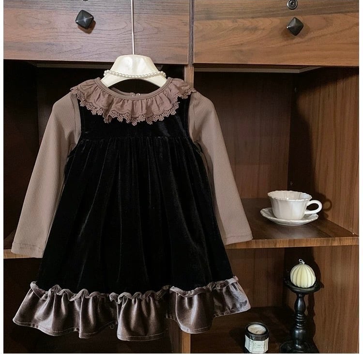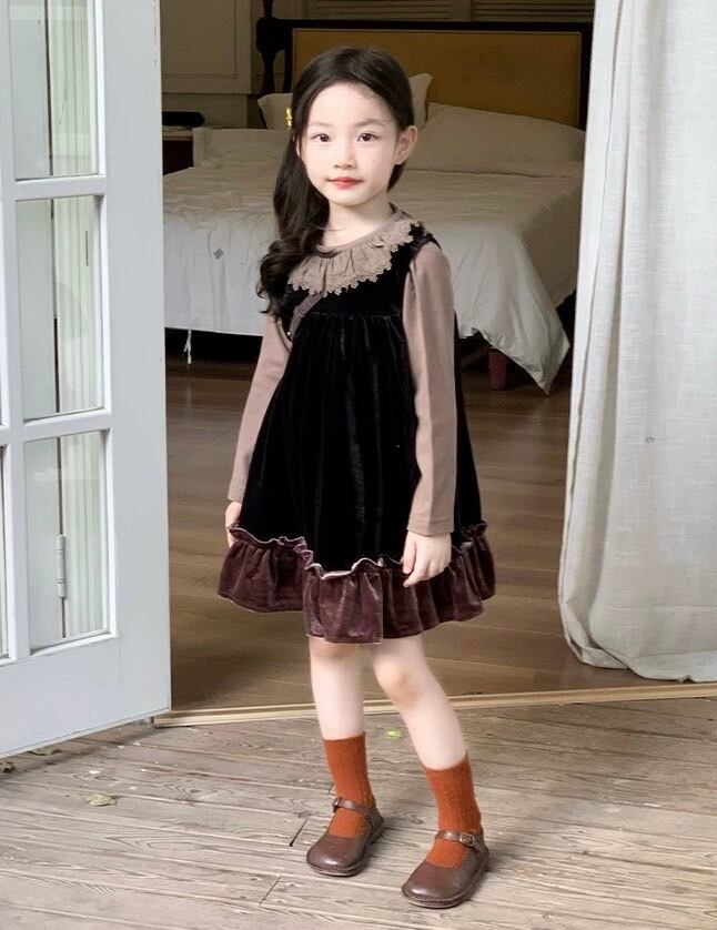 裾のフリルがお子様の可愛らしさを引き立てる、ベルベットの上品な女の子用ワンピースです。落ち着いた雰囲気のデザインで、日常のお出かけから特別な日まで幅広く活躍します。