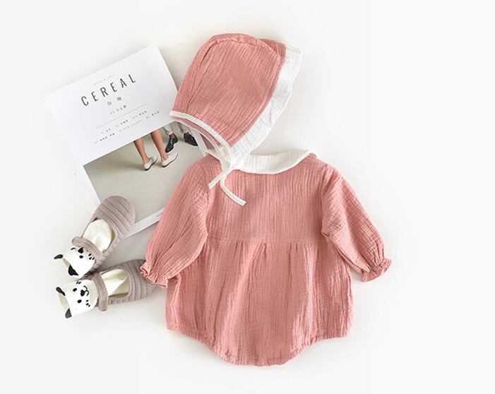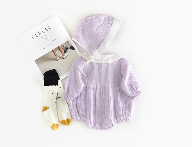 ボンネット付き 長袖 ロンパース コットン リネン 刺繍 ボンネット セット ベビー 赤ちゃん 子供 キッズ 女の子 レトロ 春 秋 出産祝い
