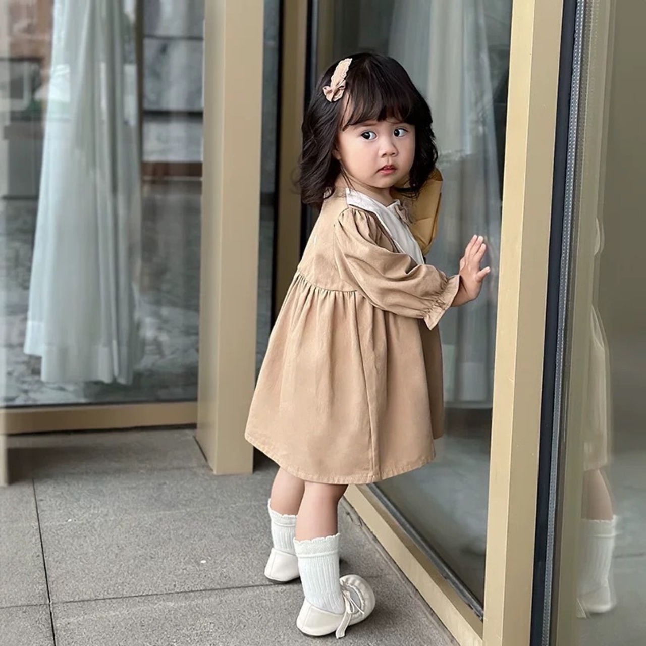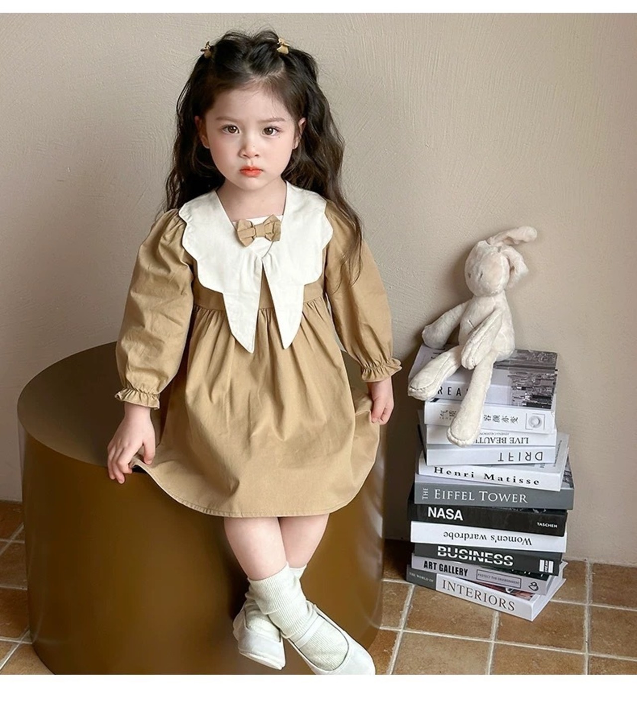 大きな襟とかわいらしいリボンがアクセントになった、主役級のワンピースです。
