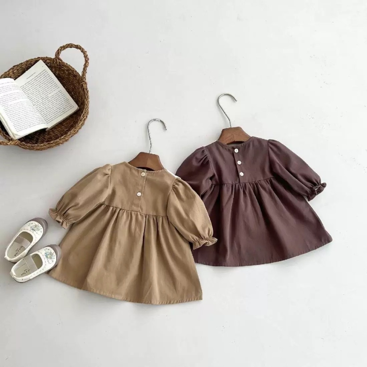 胸元からギャザーを入れることで、ふわっと広がる愛らしいシルエットに仕上げられています。生地の厚さは「標準的」で、柔らかく肌触りの良い質感が特徴です。
