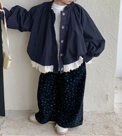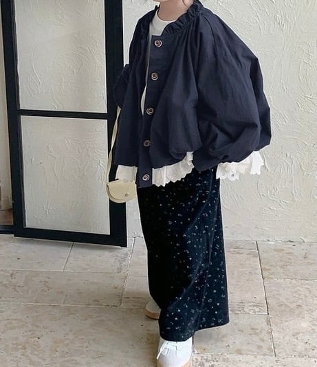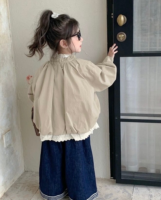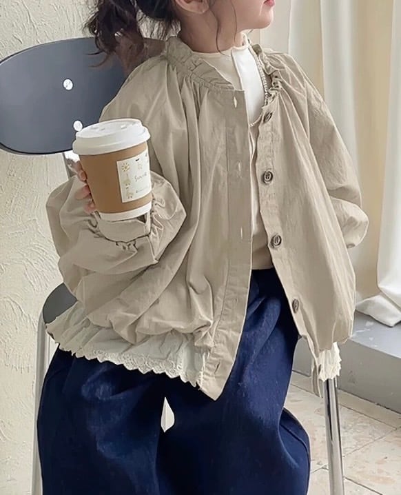 袖口にギャザーを寄せたボリュームのあるバルーンスリーブが、ふんわりとした女の子らしいシルエットを演出します。フロントはボタンで開閉でき、シャツのように軽やかに羽織れる一方で、両サイドには実用的なポケットも付いており、ライトジャケットとしての機能性も備えています。