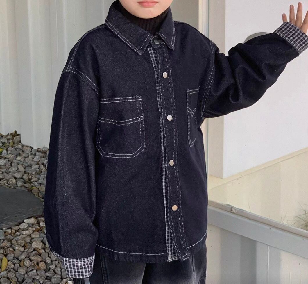 前立て、袖口にチェック柄をあしらった、デザイン性の高い厚手のデニムジャケットです。