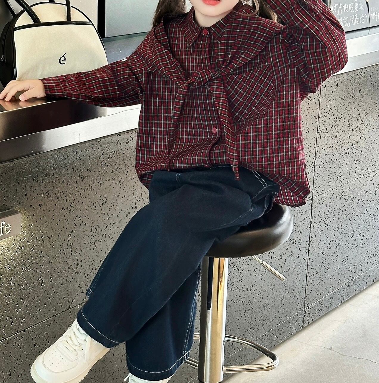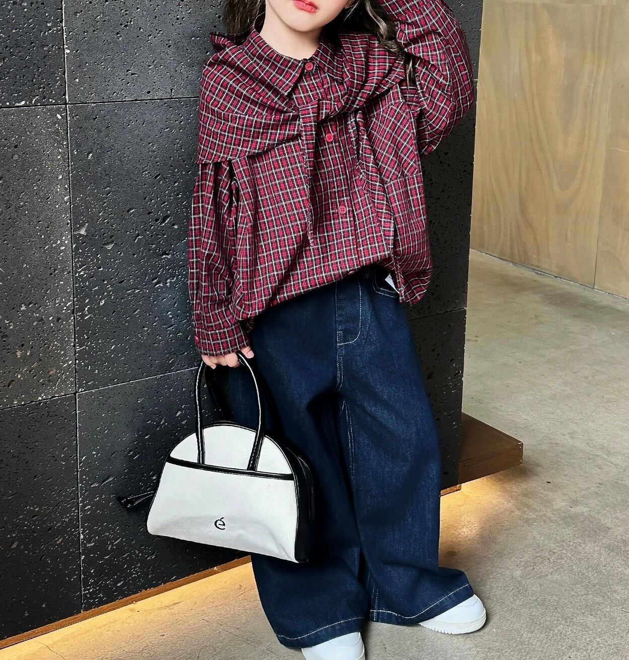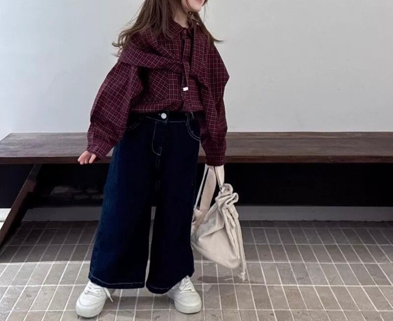 春・秋シーズンに適したカジュアルな子供用長袖チェックシャツです。