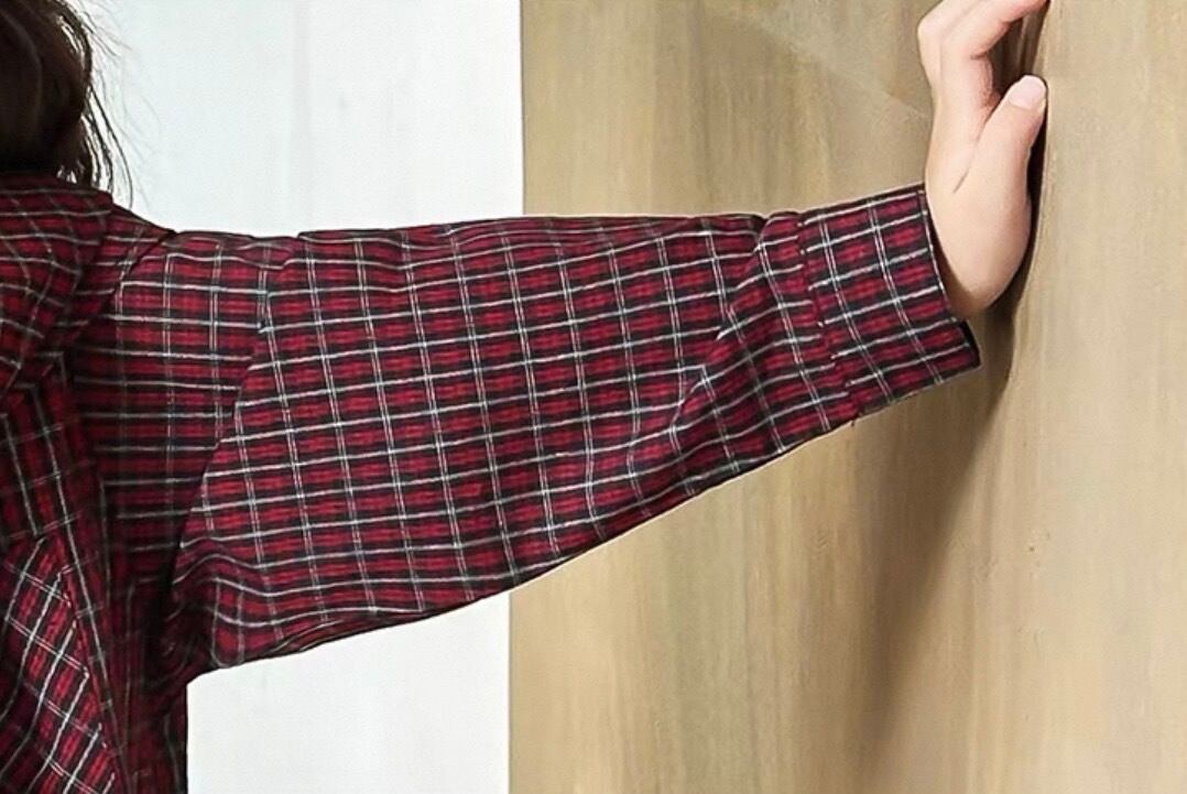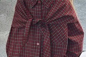 定番のチェック柄にさんかくスカーフが付いたデザインが特徴です。最大の特徴は、まるでシャツを肩に掛けて結んでいるようなフェイクレイヤード風のデザインで、これ一枚でこなれ感のあるスタイリングが完成します。バックスタイルもスカーフの角が垂れるような印象的な仕上がりに。