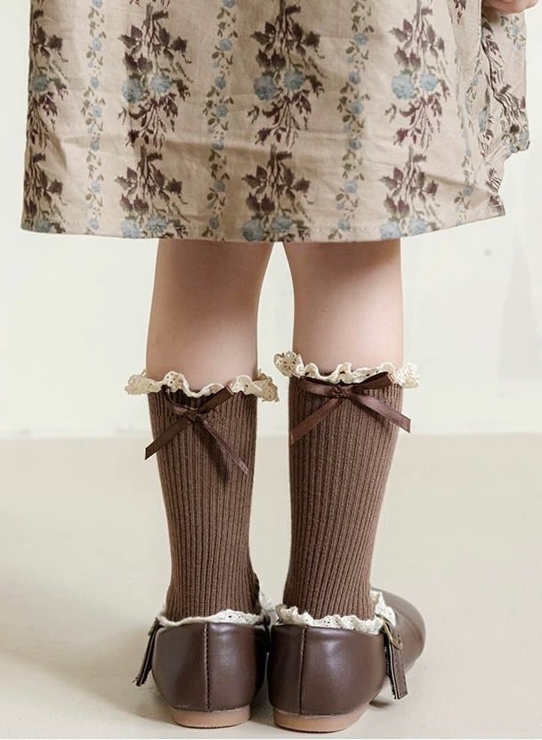 履き口に華やかなレースと可愛らしいリボンをあしらった、女の子向けのリブソックスです。