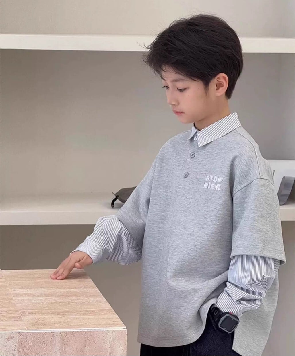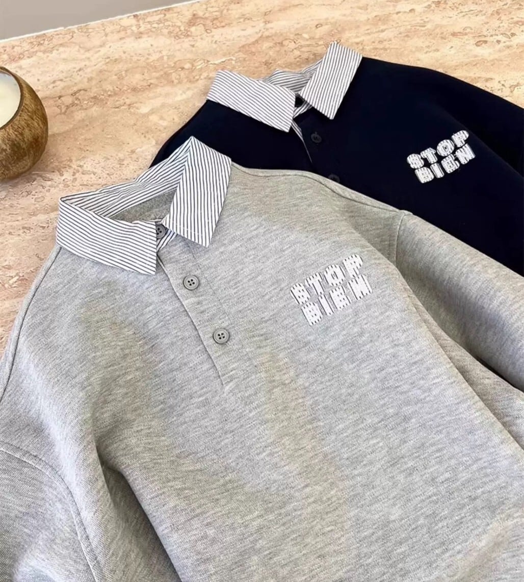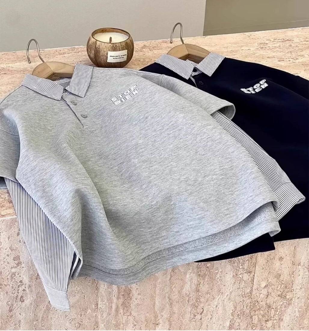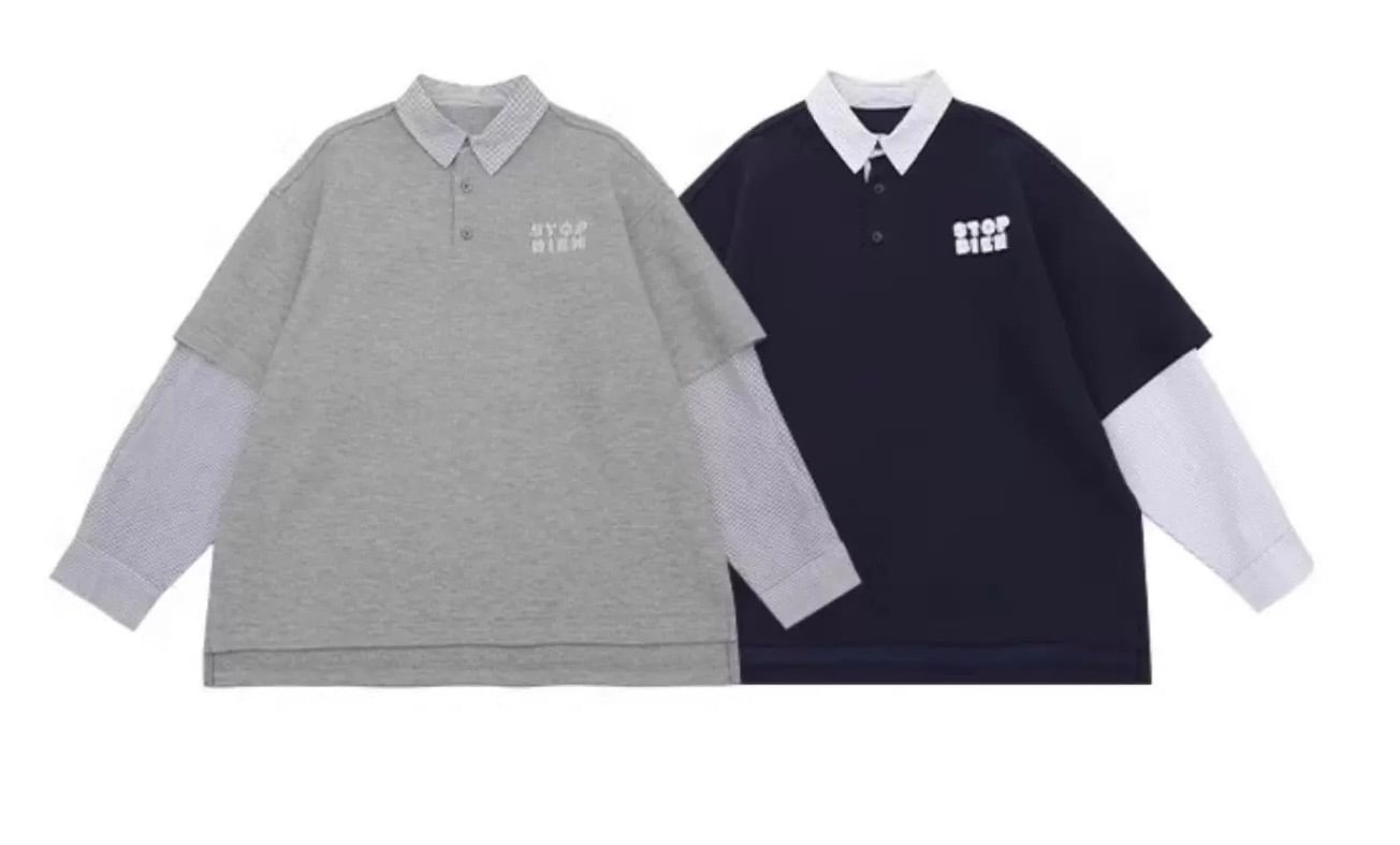 1枚でキマる!重ね着風ストライプ袖のロゴ入りポロプルオーバー