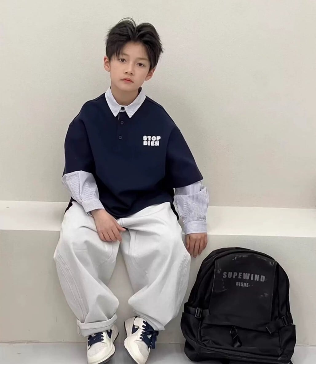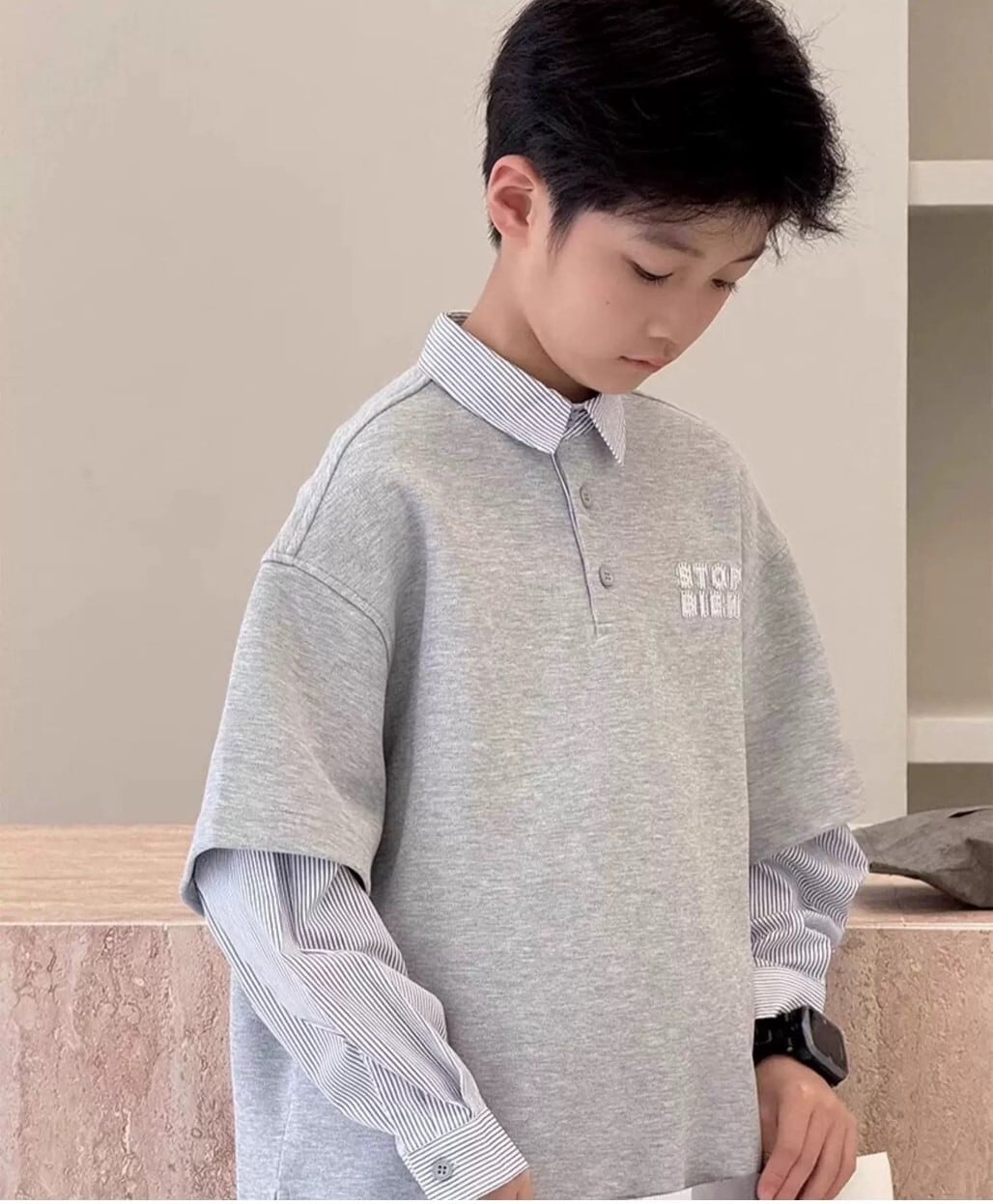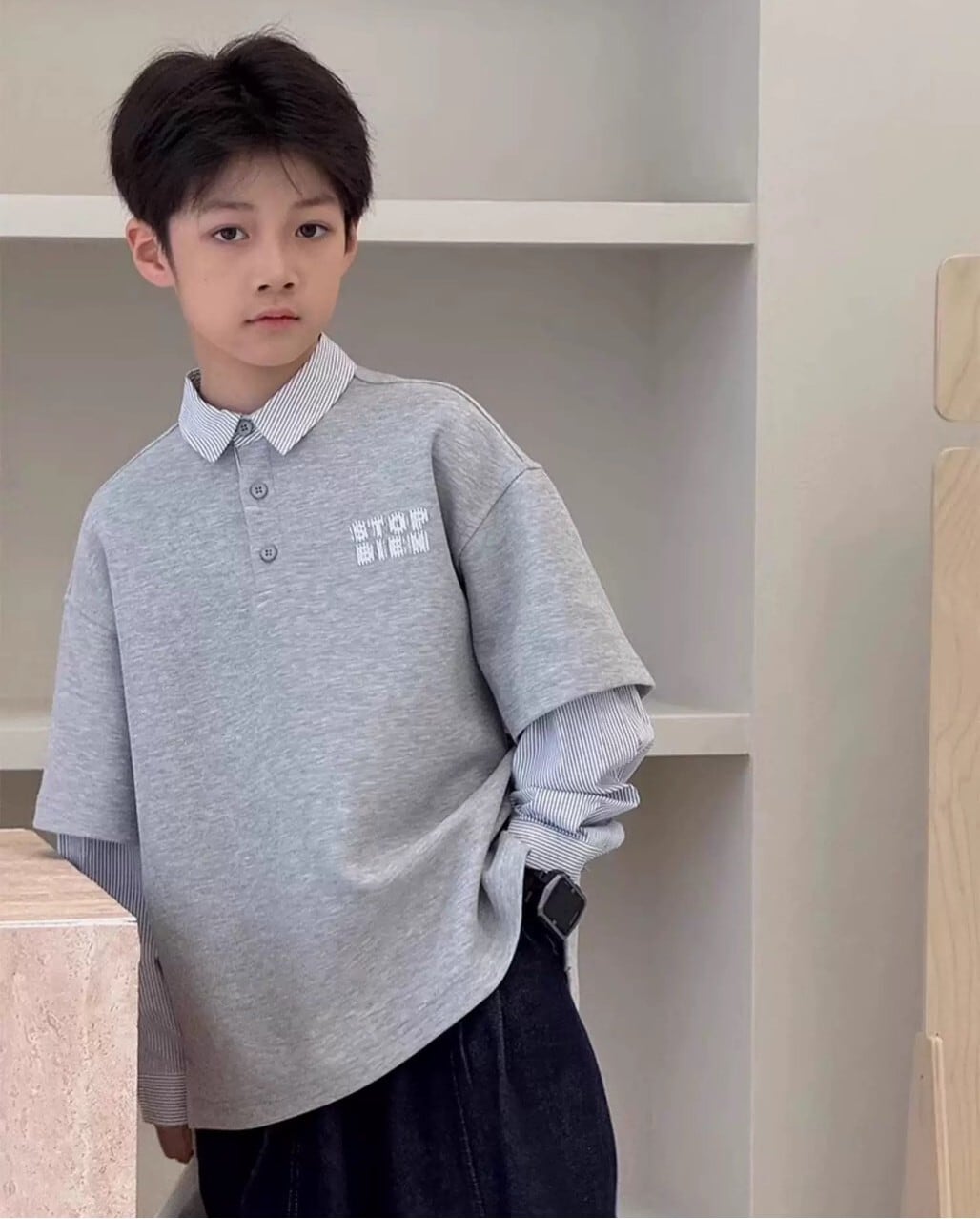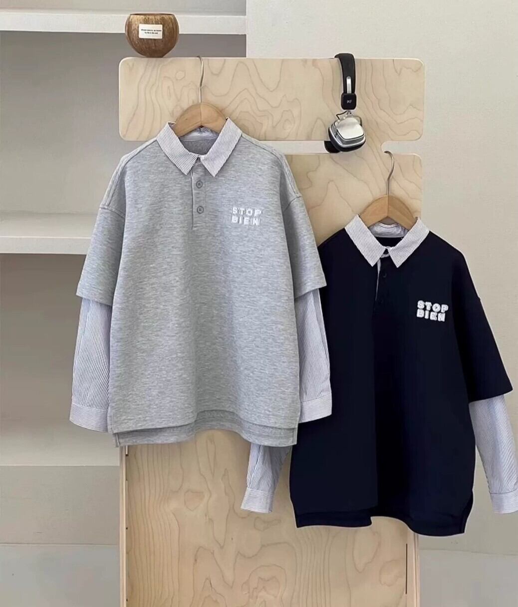 1枚でキマる!重ね着風ストライプ袖のロゴ入りポロプルオーバー