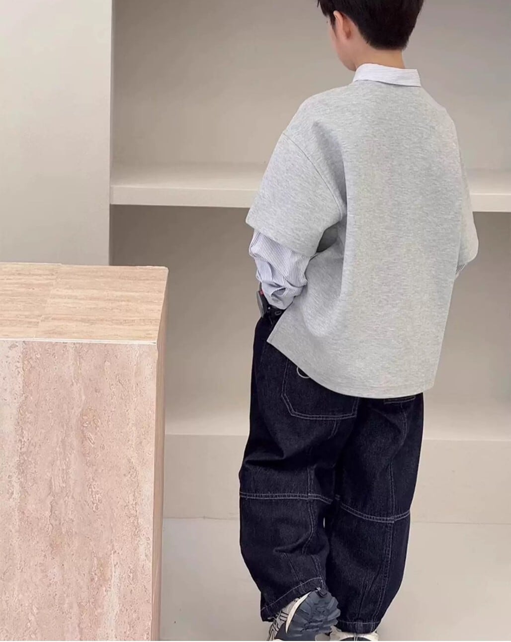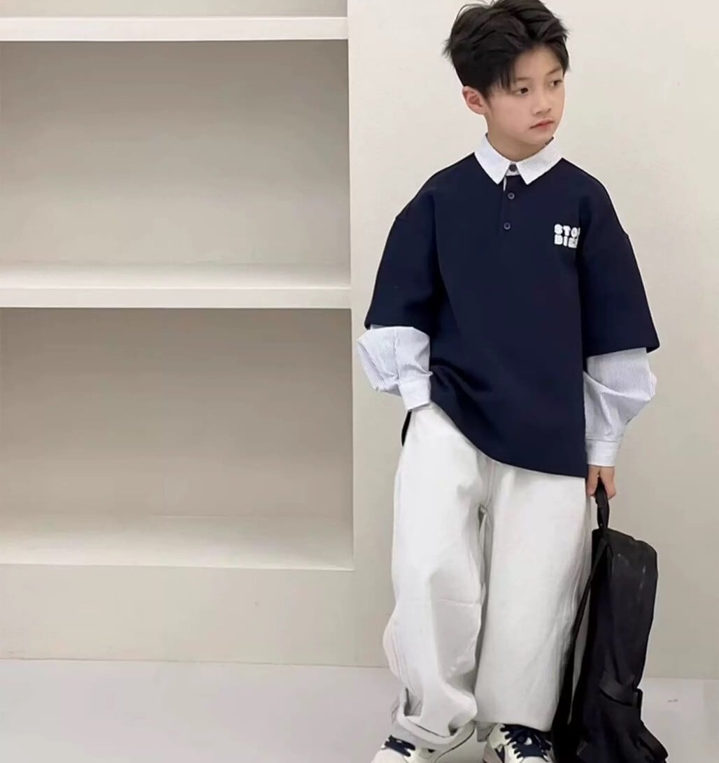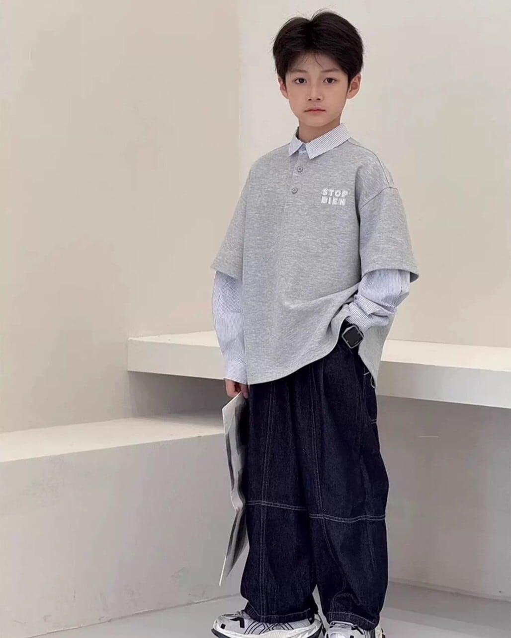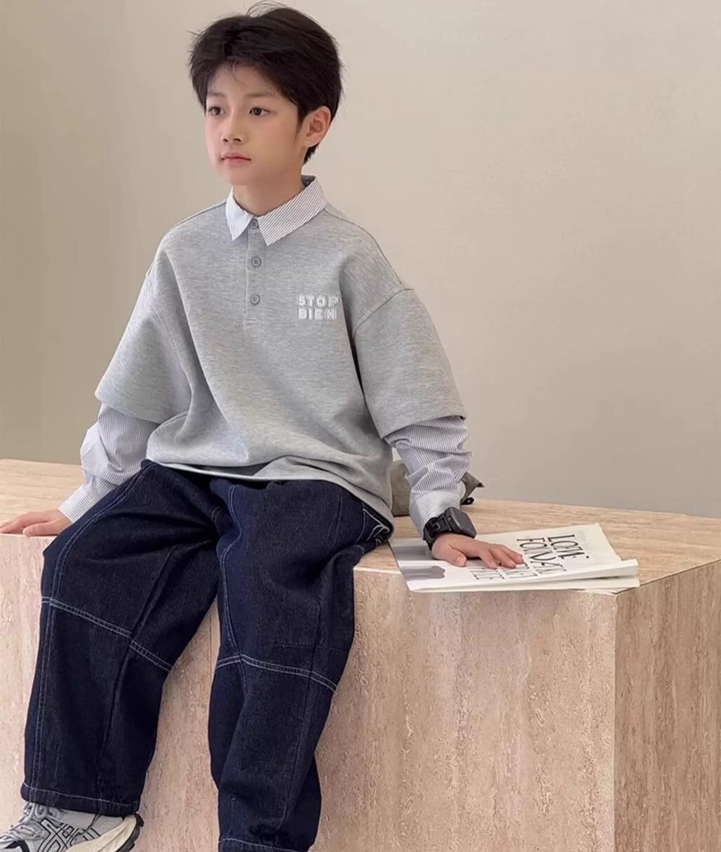 1枚でキマる!重ね着風ストライプ袖のロゴ入りポロプルオーバー