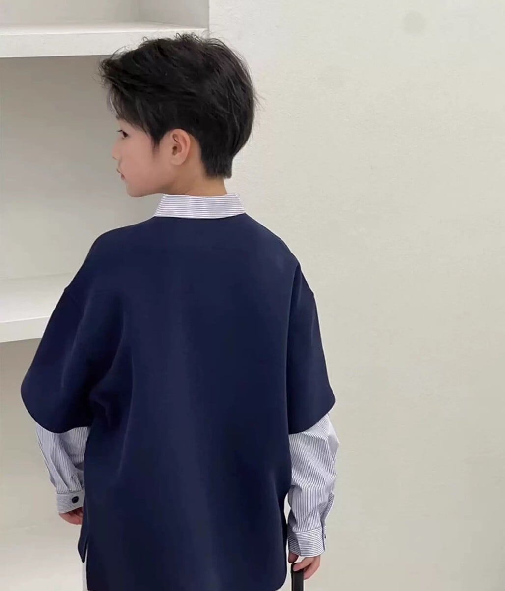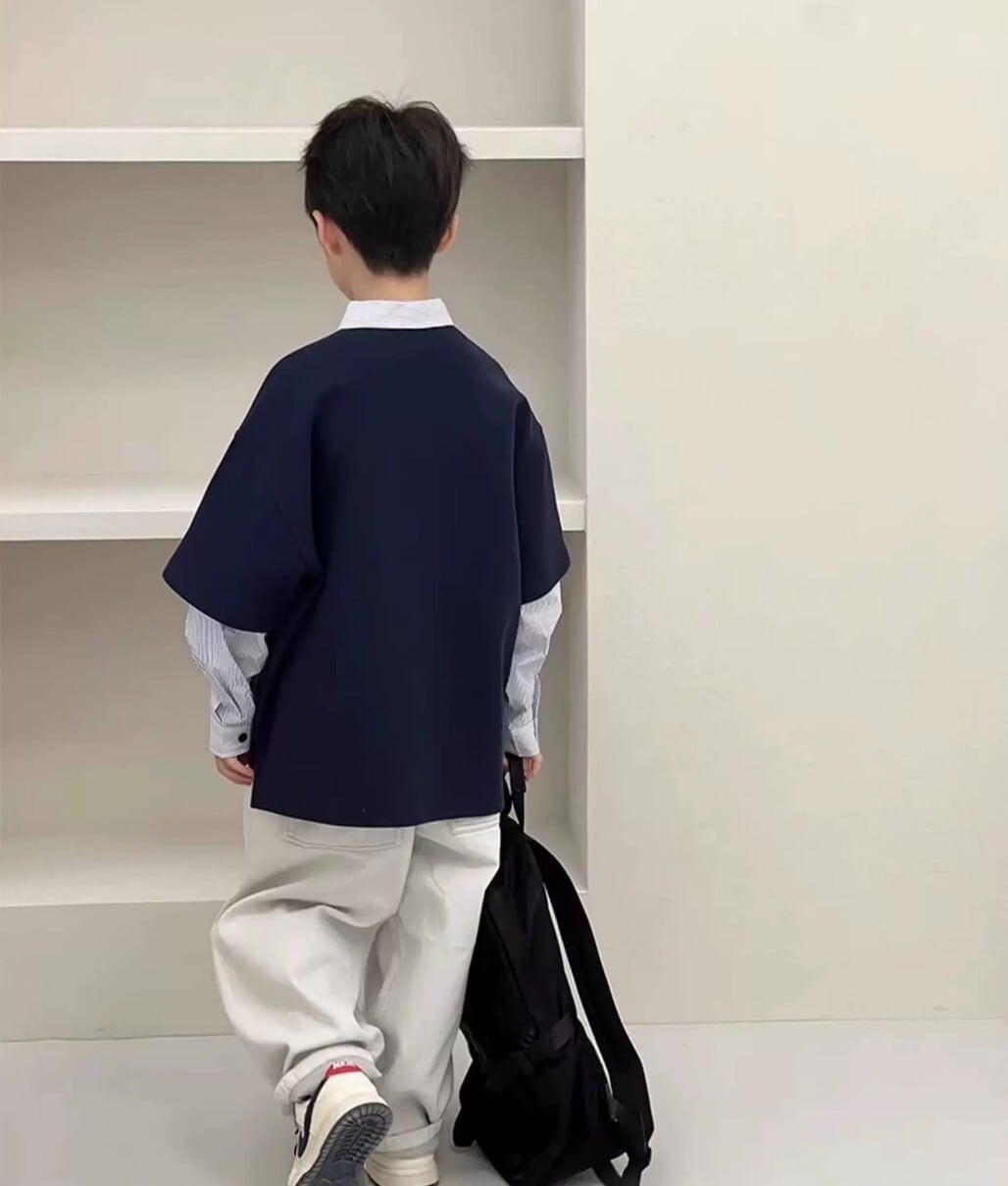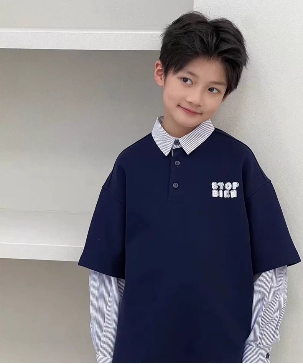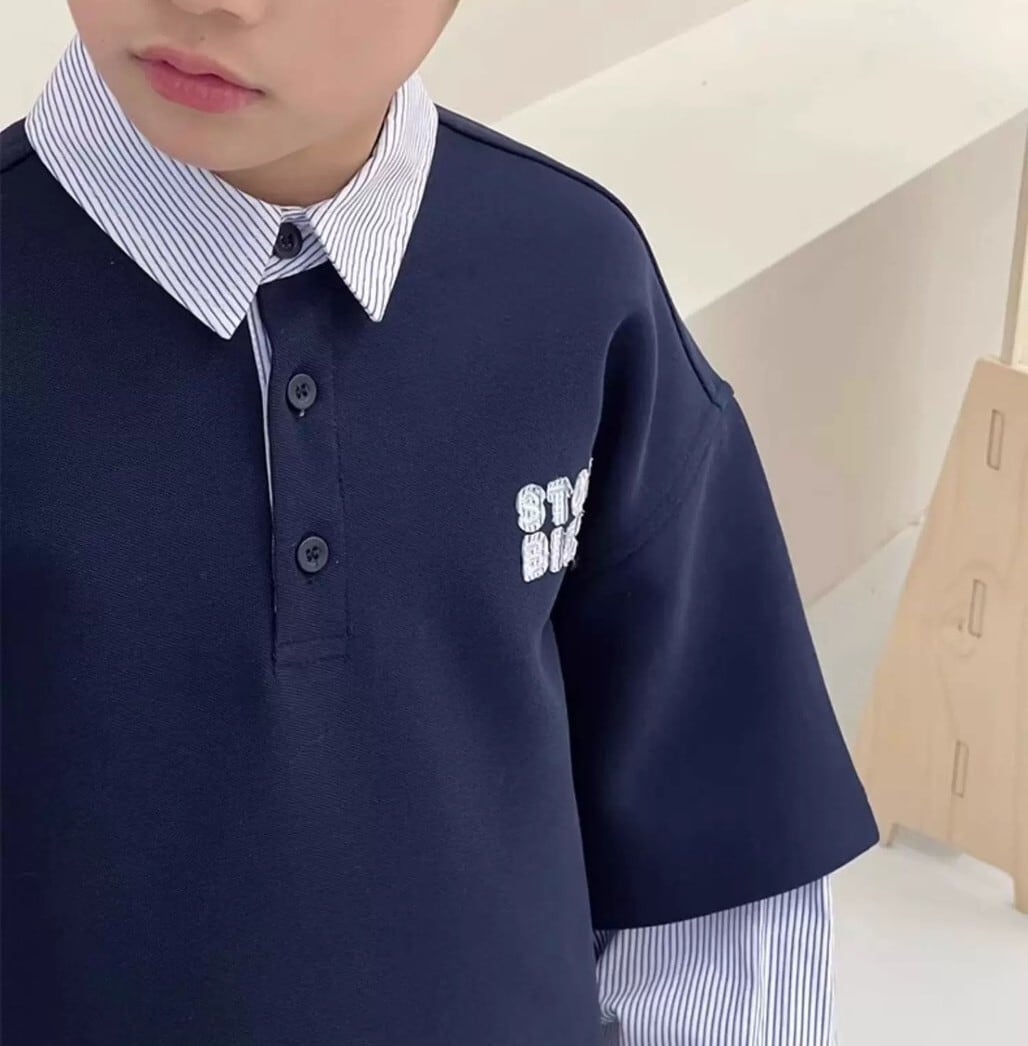 ポロシャツの下にストライプ柄のシャツを合わせたような清潔感のあるデザインで、胸元にはおしゃれなロゴのアクセントがあしらわれています。スマートな印象を与えつつ、デイリーからちょっとしたお出かけまで幅広く活躍するアイテムです。