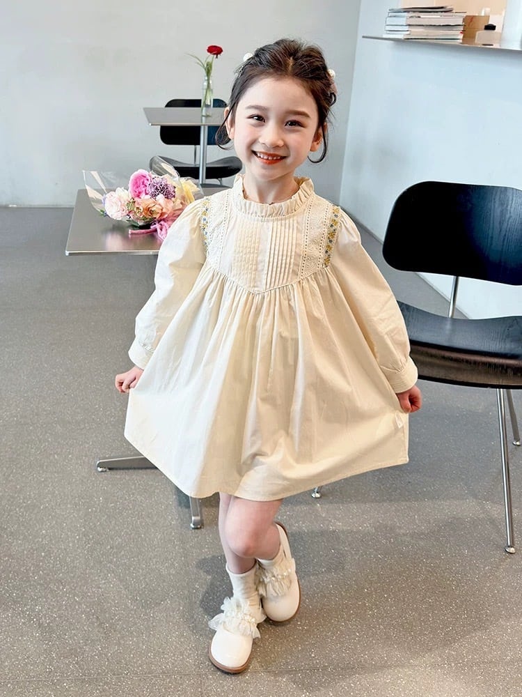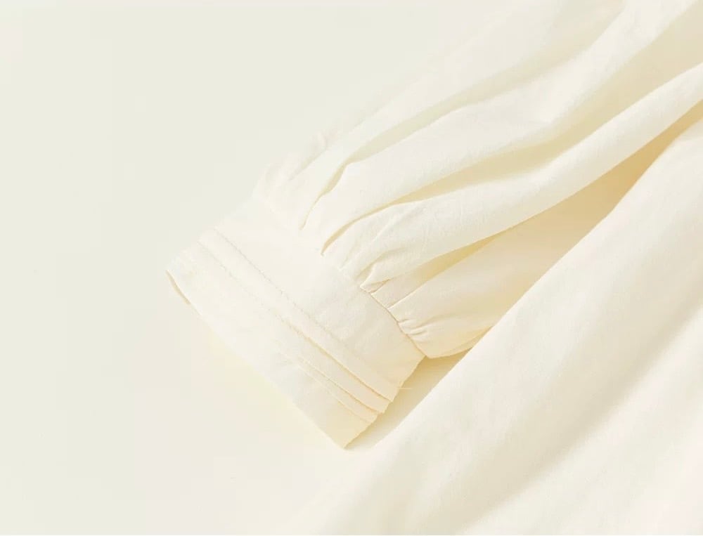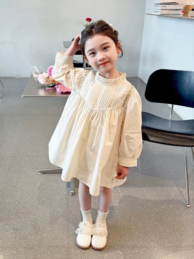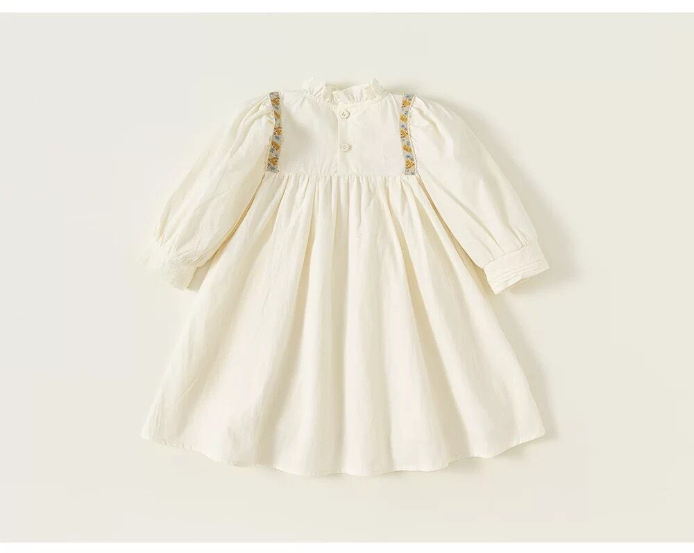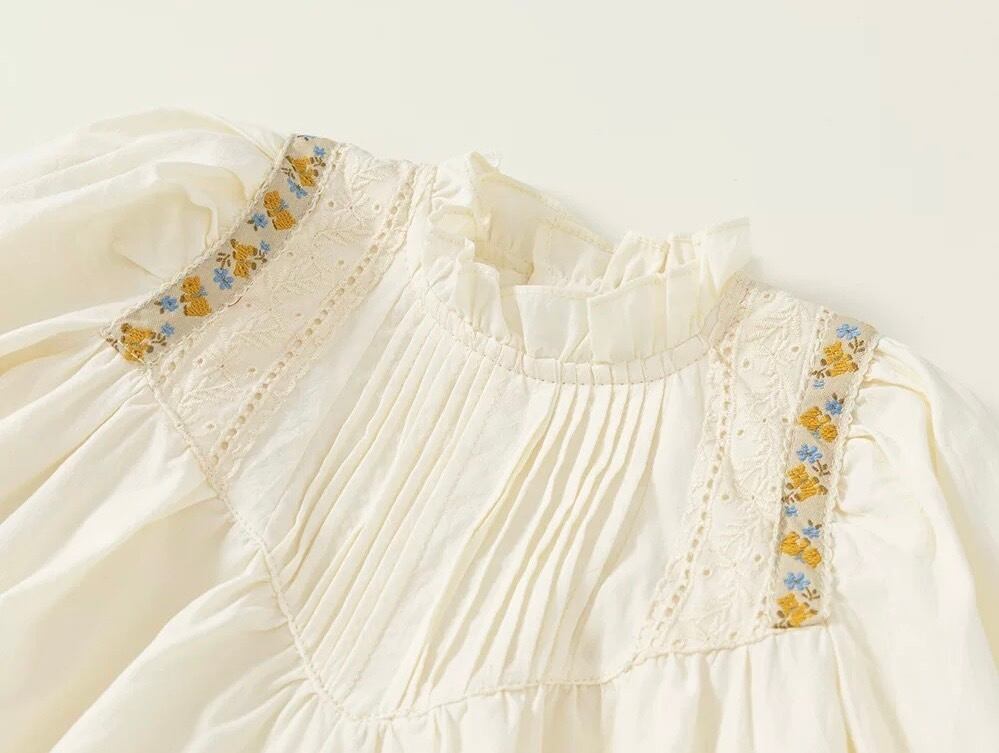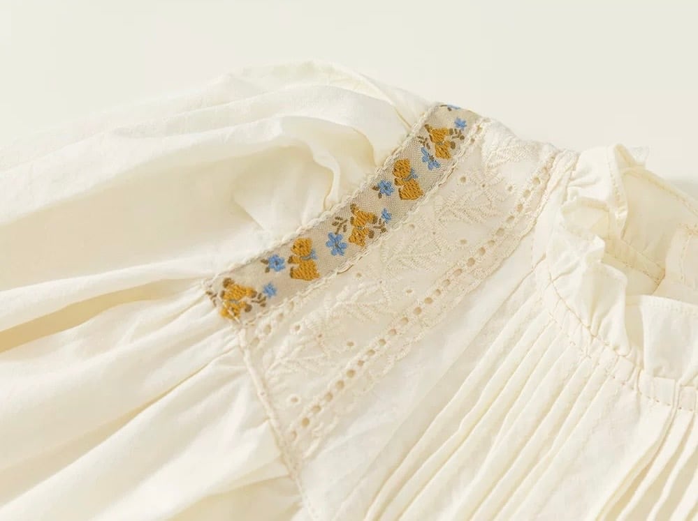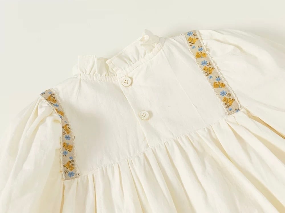 胸元には繊細なタック(プリーツ)が施され、肩から胸元にかけてあしらわれた刺繍テープとレースが華やかさを添えています。首元は柔らかなフリル襟のデザインで、お顔周りを可愛らしく演出します。背中側にはボタンが付いており、デザインのアクセントになると共にお着替えもしやすい仕様です。