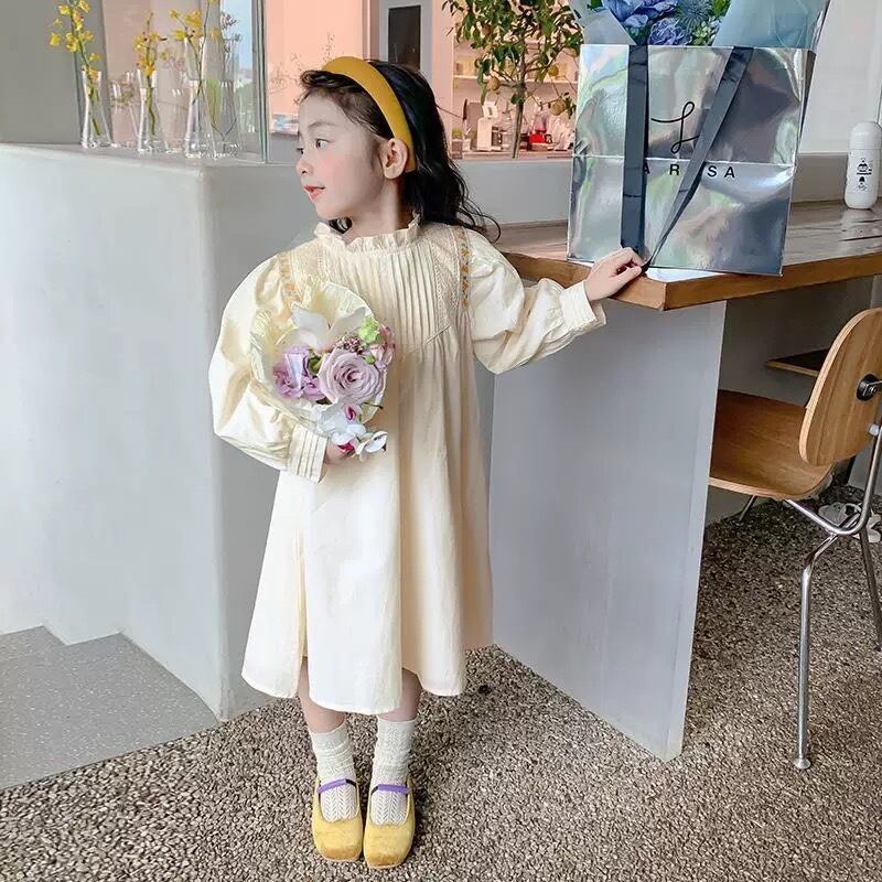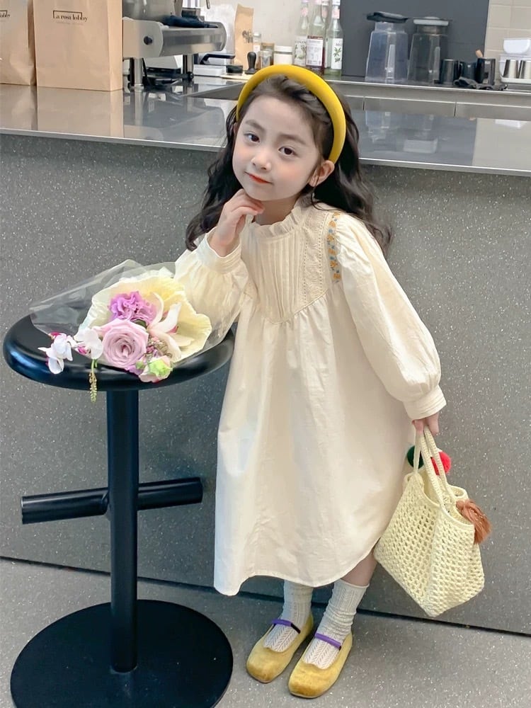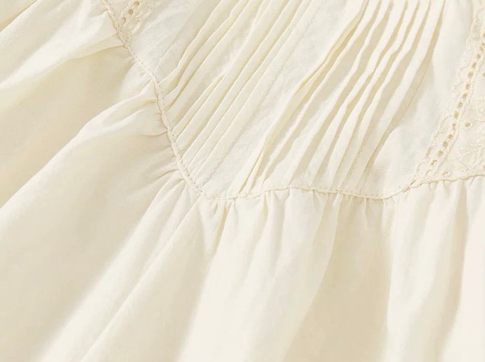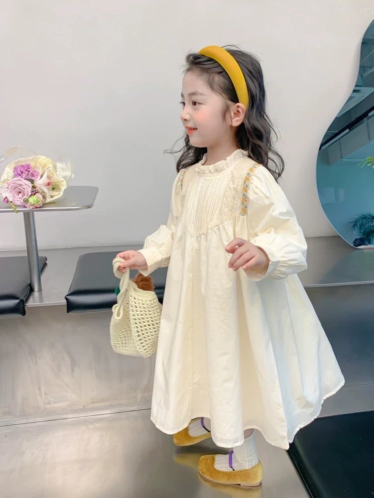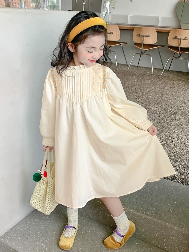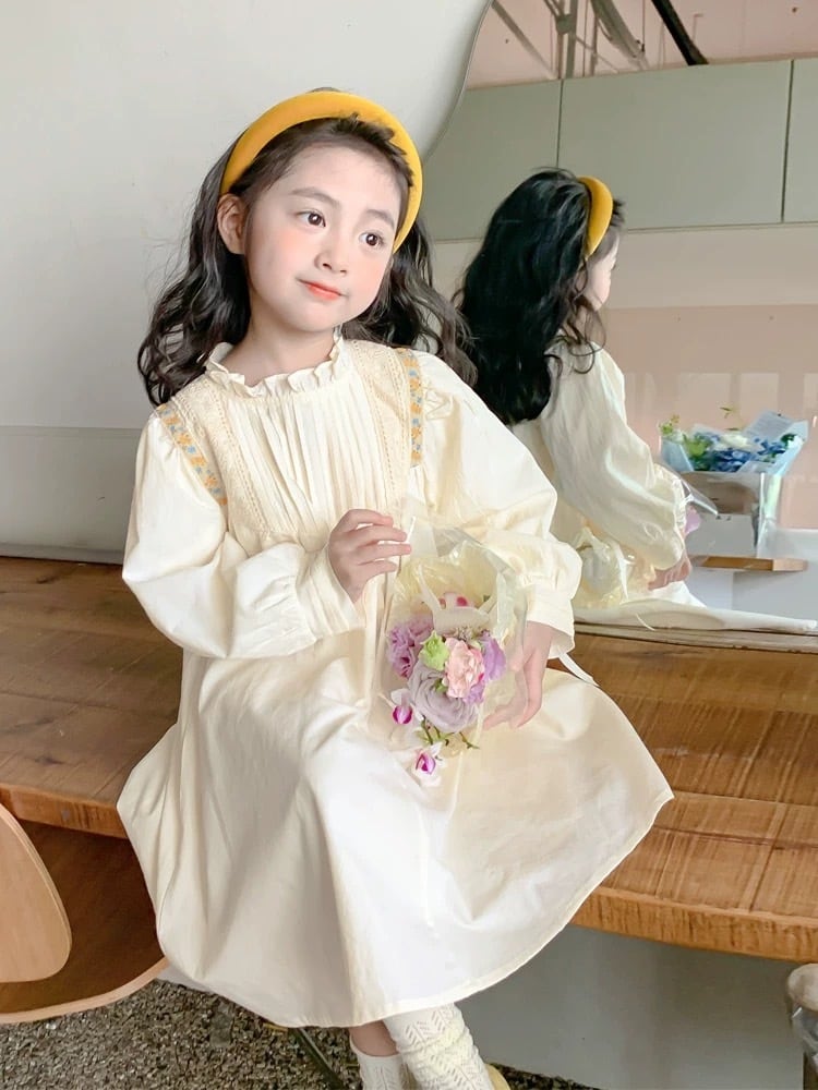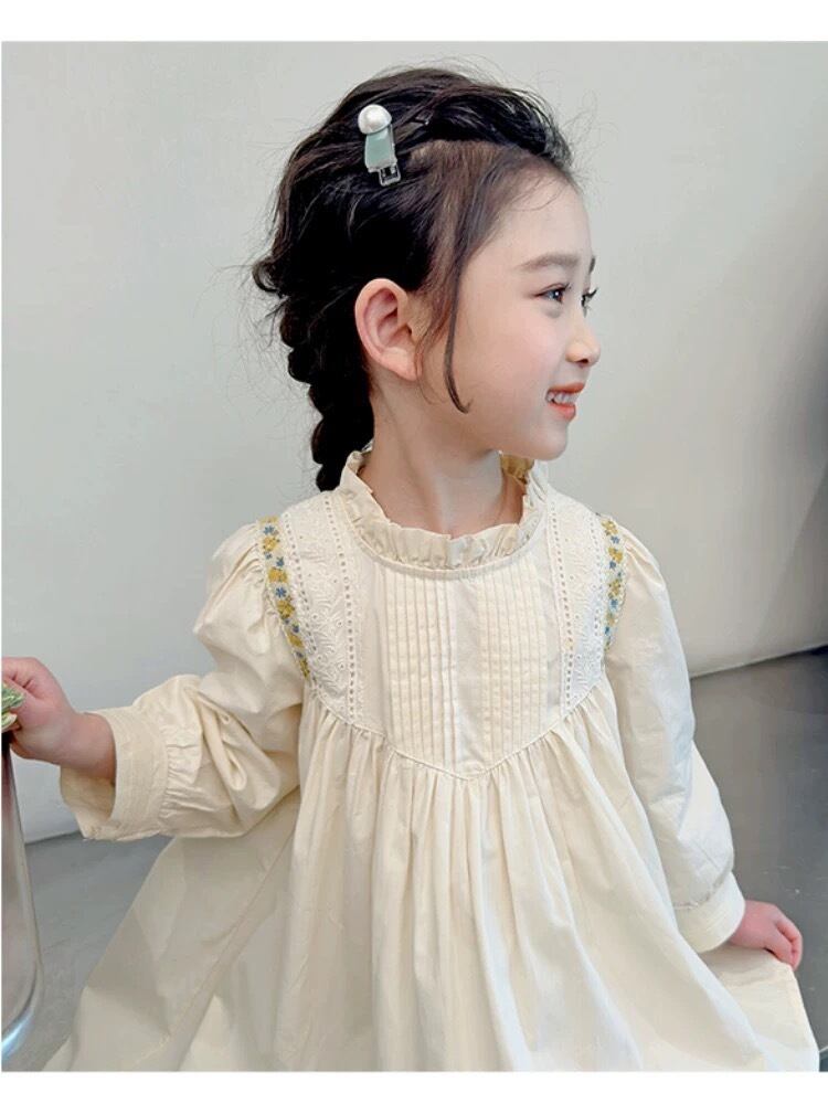 胸元には繊細なタック(プリーツ)が施され、肩から胸元にかけてあしらわれた刺繍テープとレースが華やかさを添えています。首元は柔らかなフリル襟のデザインで、お顔周りを可愛らしく演出します。背中側にはボタンが付いており、デザインのアクセントになると共にお着替えもしやすい仕様です。