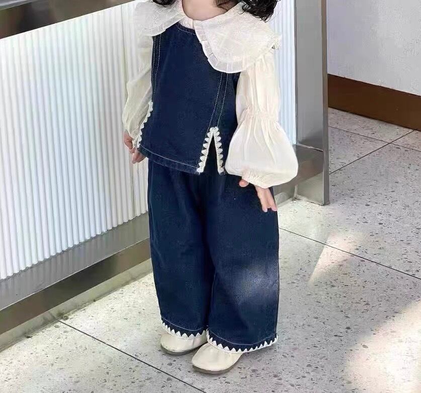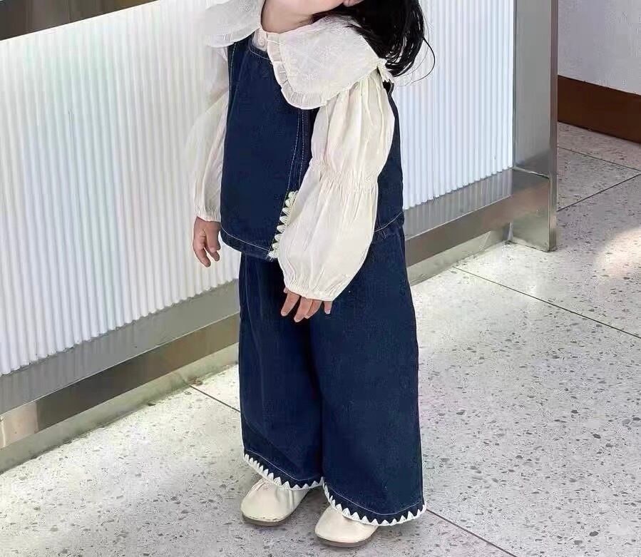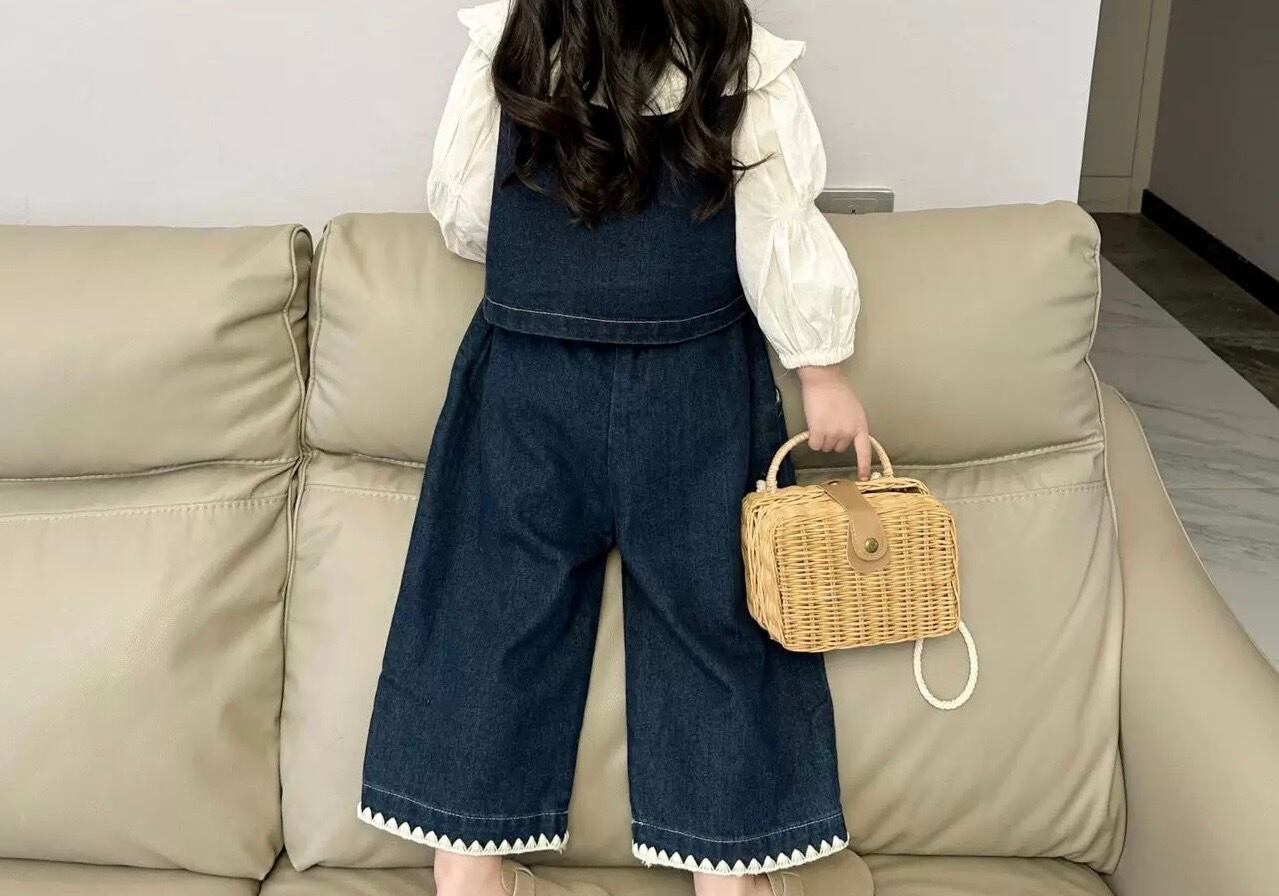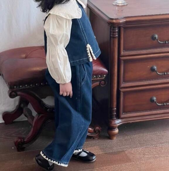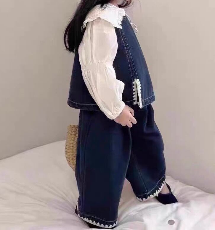 ベストの両サイドに入ったスリットと、パンツの裾にあしらわれた白いギザギザの装飾が目を引くデザインになっています。シンプルながらもディテールにこだわった一着で、お手持ちのトップスと合わせるだけでこなれ感のあるスタイルが完成します。