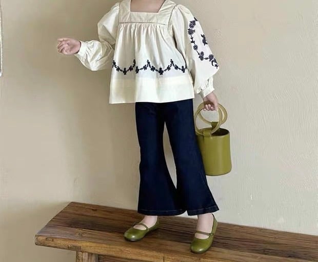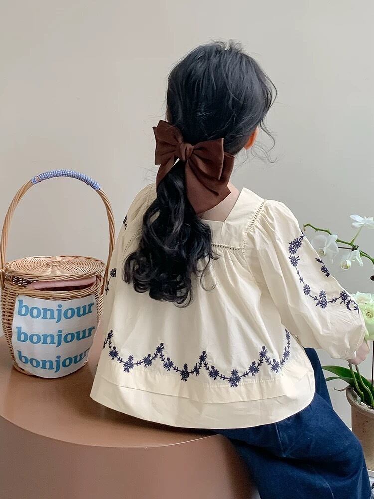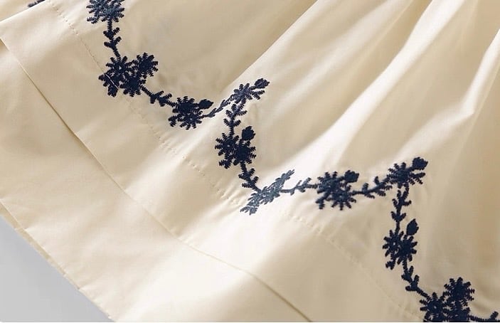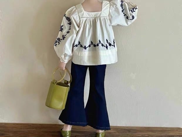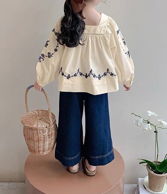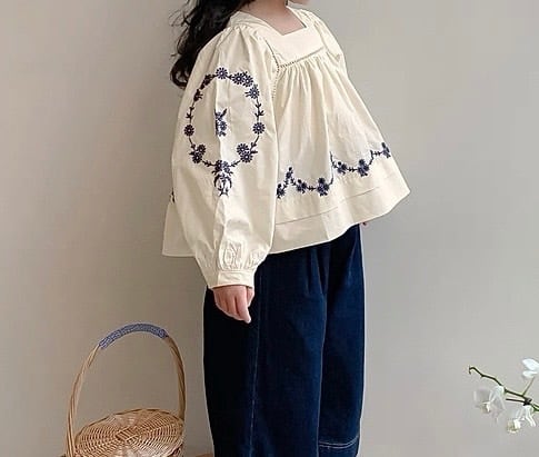 袖と裾にあしらわれた繊細な花柄の刺繍が目を引く、上品で可愛らしいブラウスです。