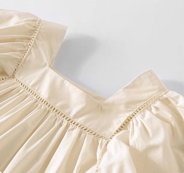 デコルテをすっきりと見せてくれるスクエアネックの縁には、透け感のあるはしごレースの装飾が施されています。 ふんわりとしたパフスリーブと、裾に向かって広がるフレアなシルエットが、女の子らしい柔らかな印象を演出します。