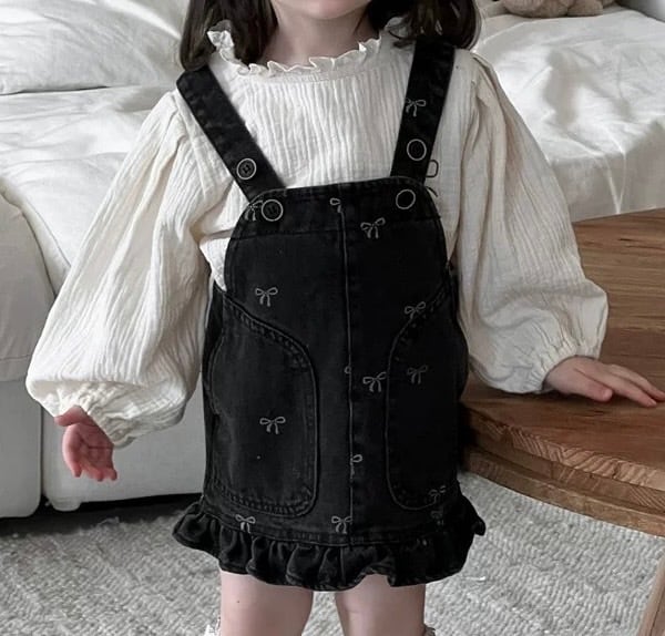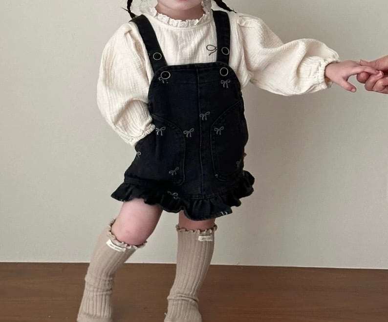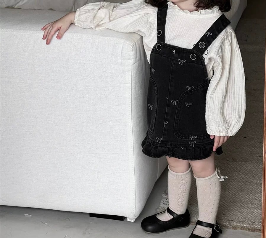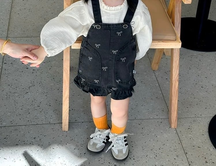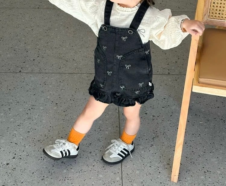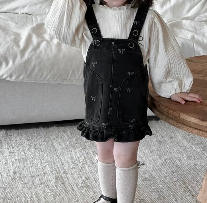 全体に可愛らしいリボンの刺繍が散りばめられたデニム素材のジャンパースカートです。