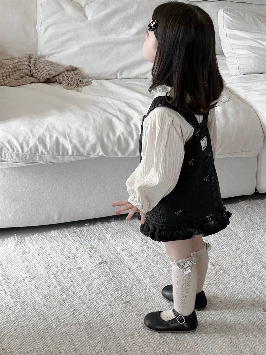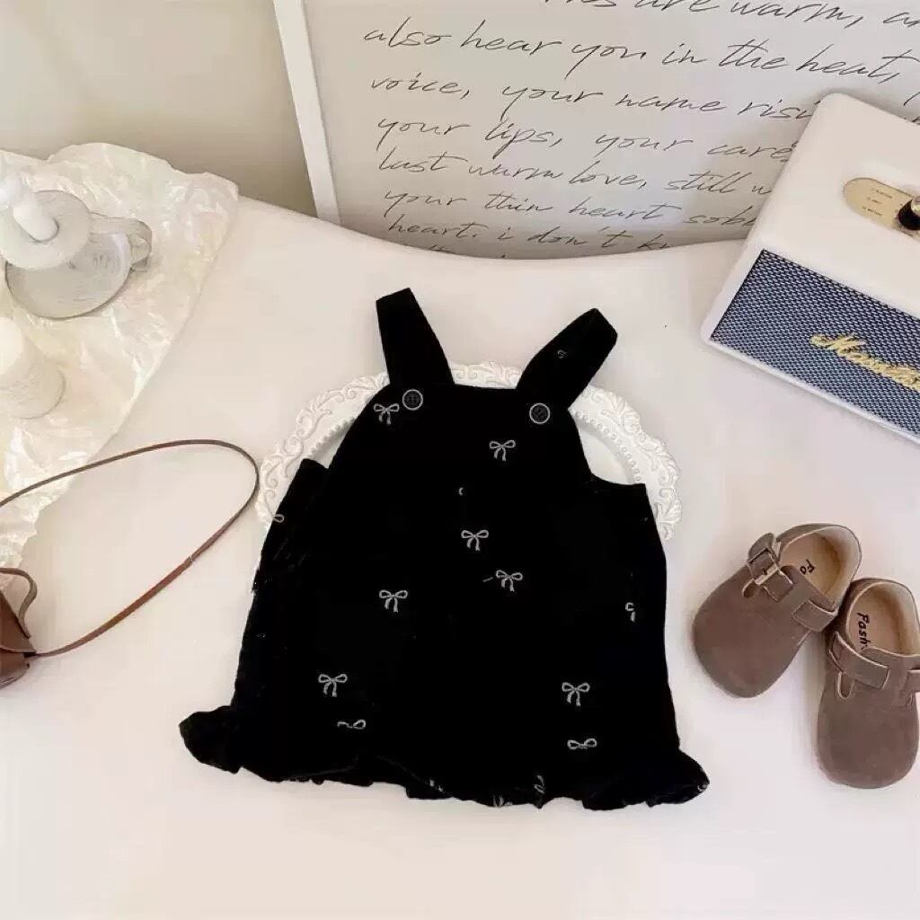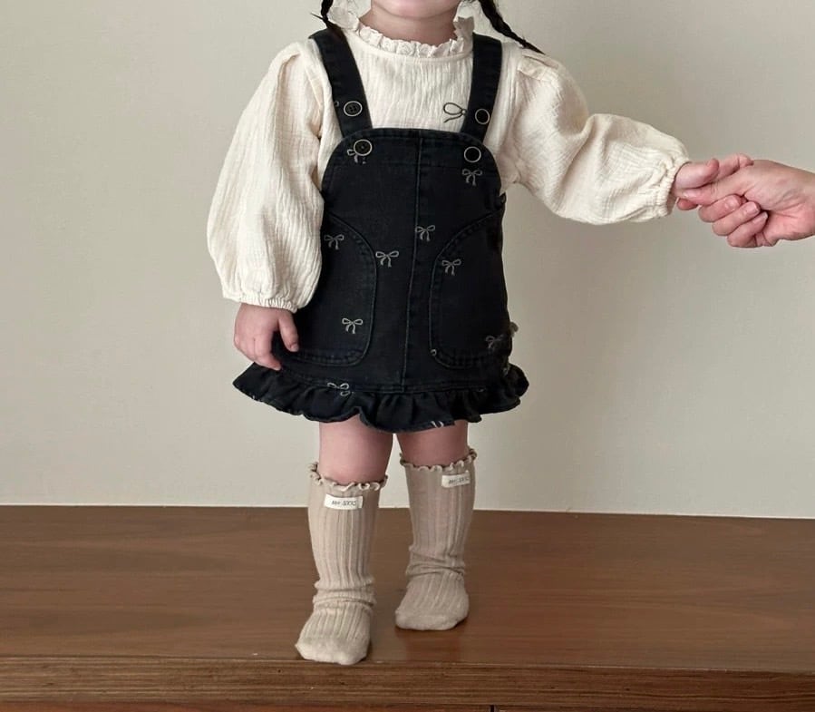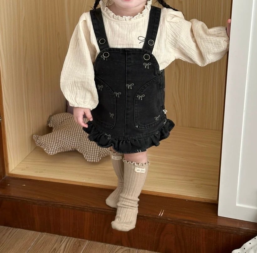 全体に可愛らしいリボンの刺繍が散りばめられたデニム素材のジャンパースカートです。