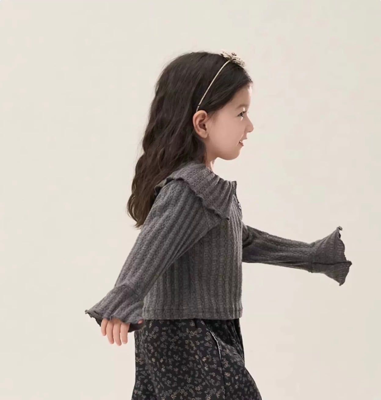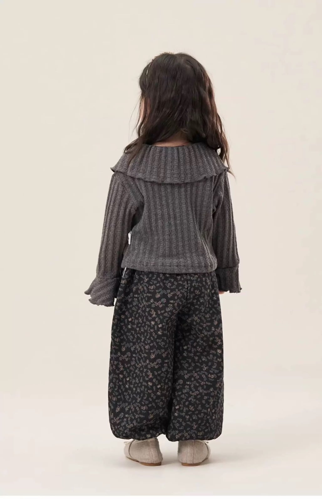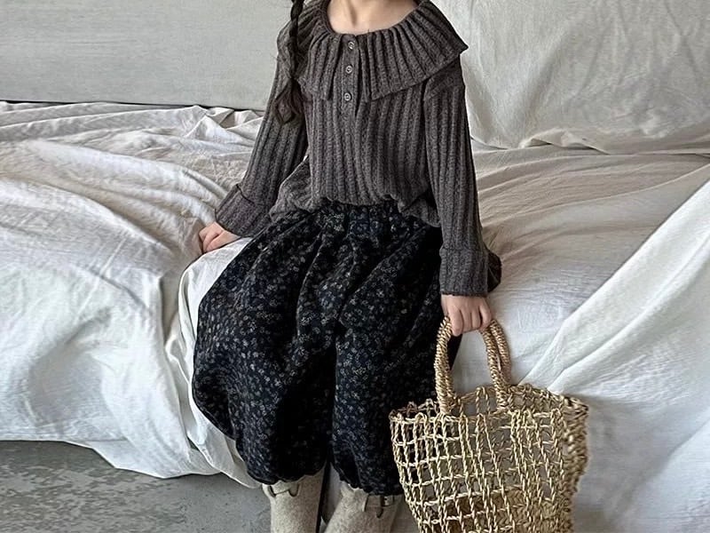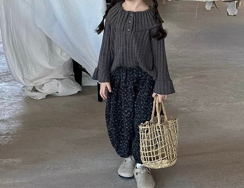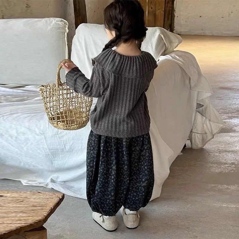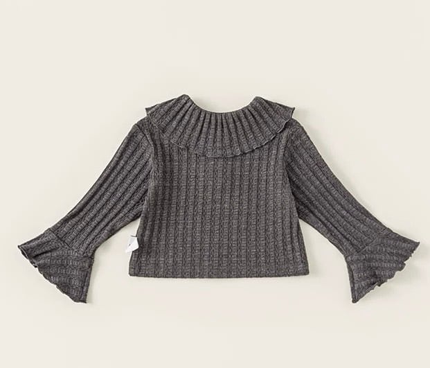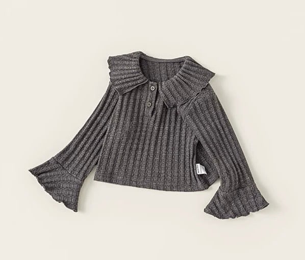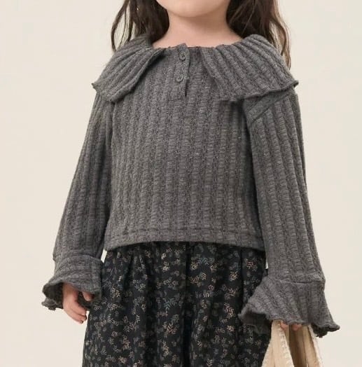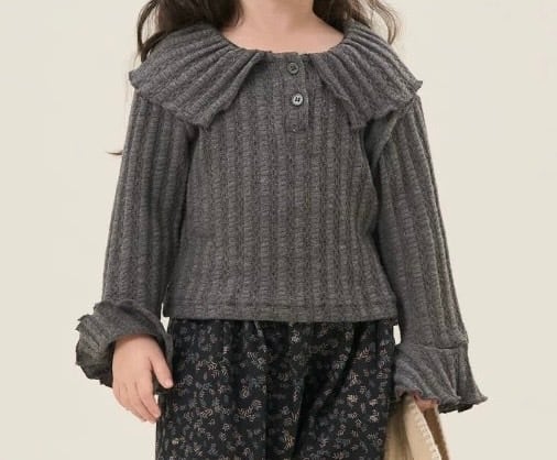 大きなフリル襟が特徴的な、大人っぽさと可愛らしさを兼ね備えた子供用リブニットです。