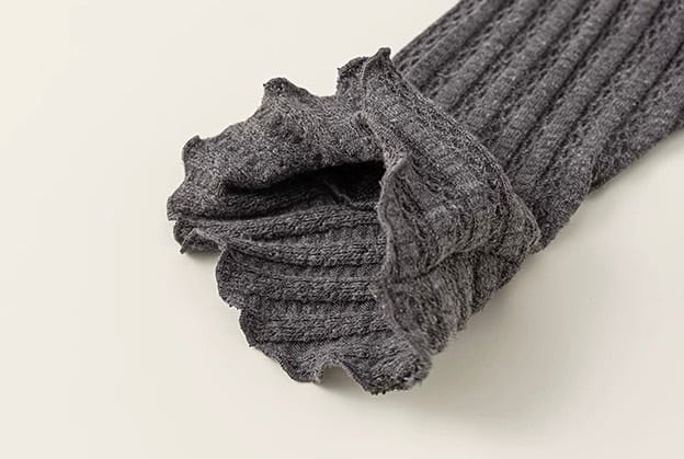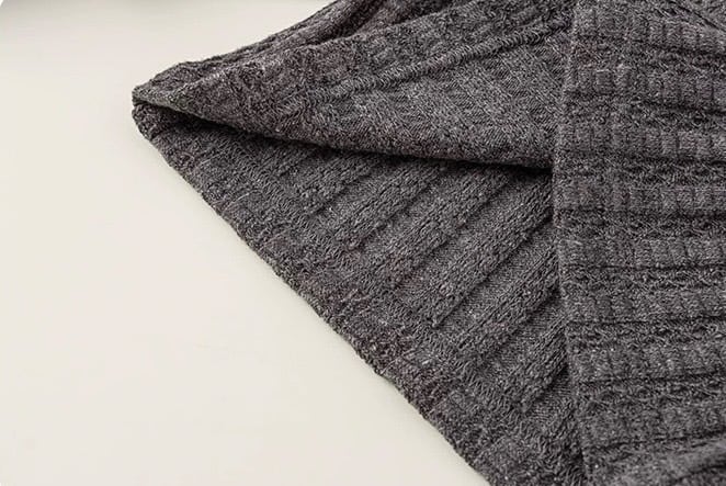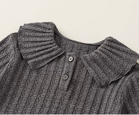 首元にはボタンがあしらわれており、デザインのアクセントになっています。袖口はふんわりと広がるフレアスリーブのデザインで、手元を華やかに見せてくれます。全体に施されたリブ編みが、すっきりとしたシルエットを演出します。