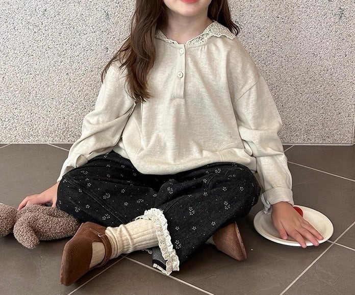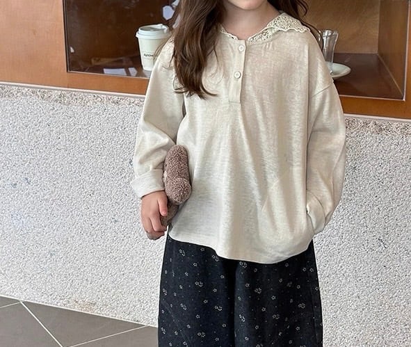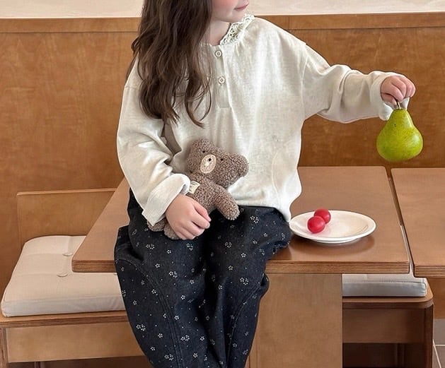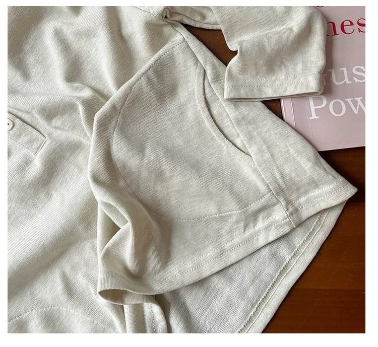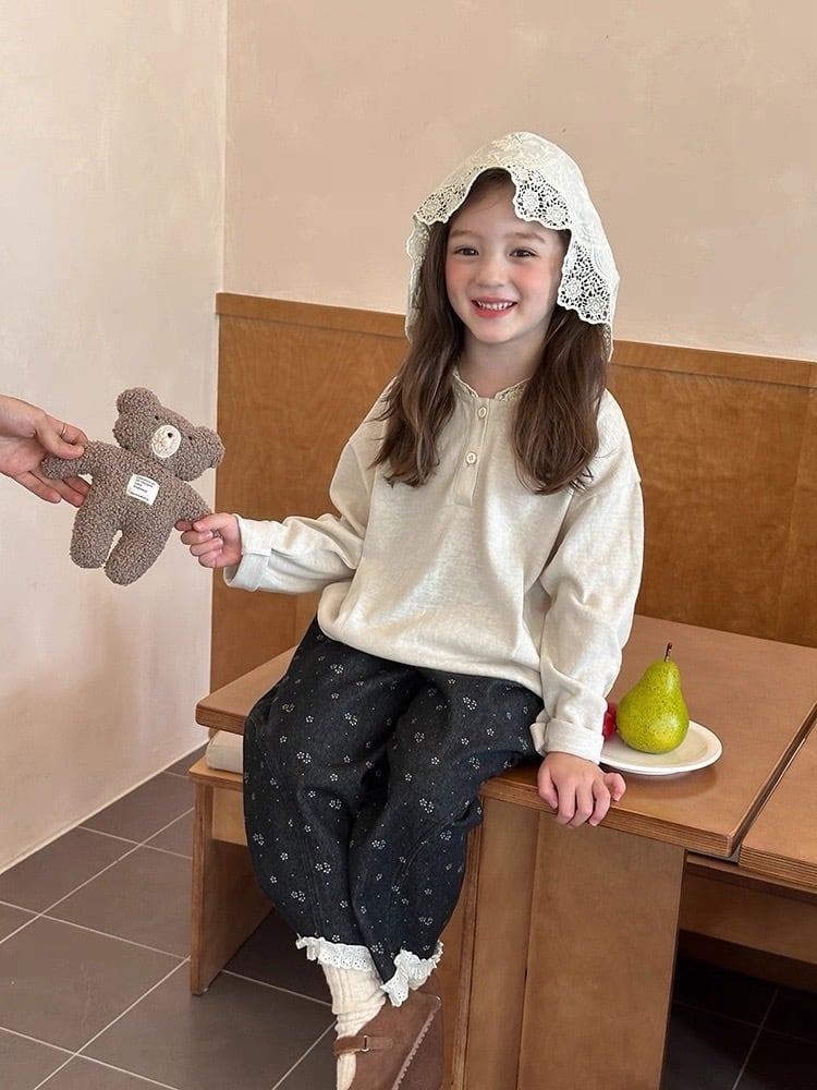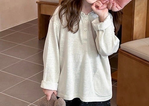 ゆったりとしたシルエットでリラックス感があり、カジュアルな長袖Tシャツに上品な甘さをプラスしています。首元には3つのボタンがあしらわれたヘンリーネックデザインで、お顔周りをすっきりと見せてくれます。