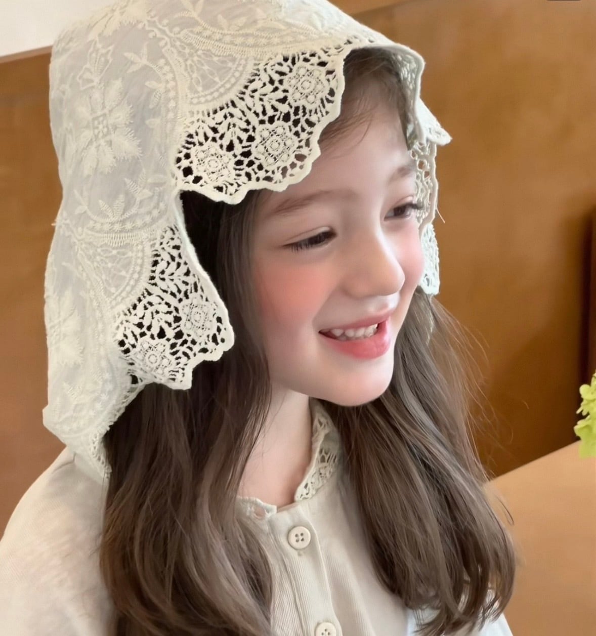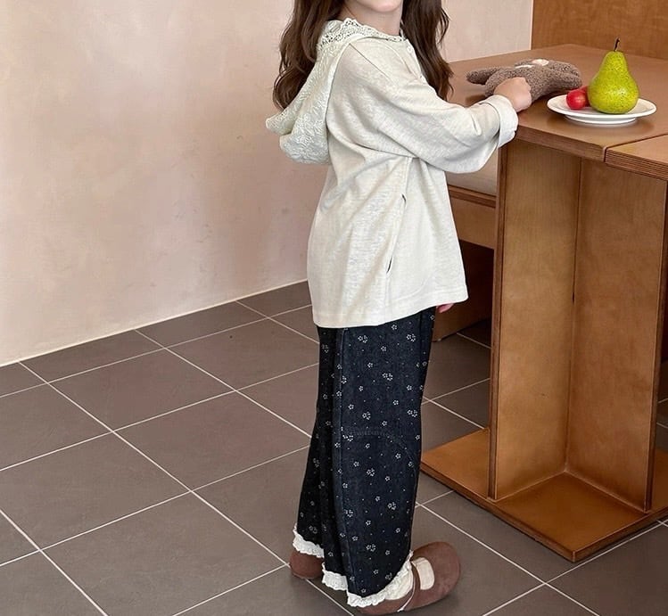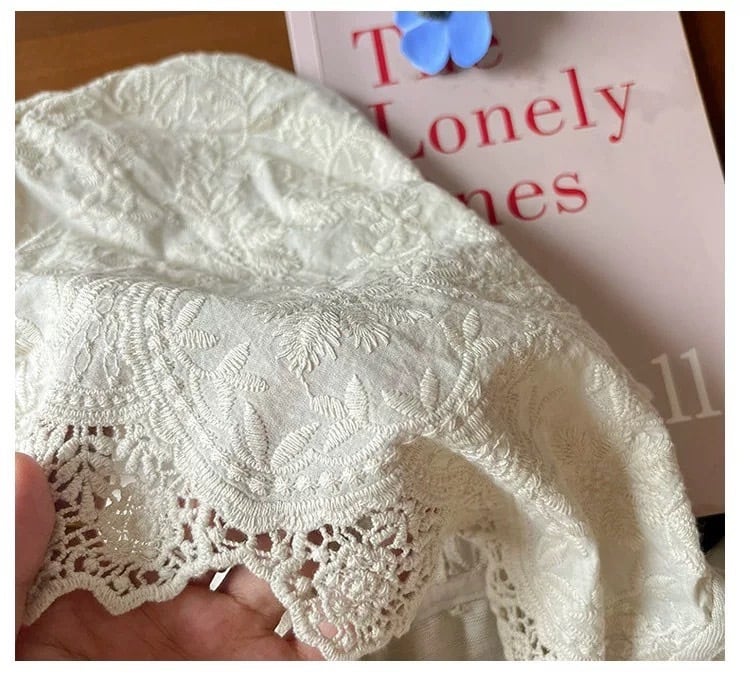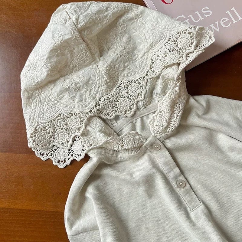 フード部分に施されたレース刺繍と、縁取りのカットワークが目を惹く華やかな一枚です。