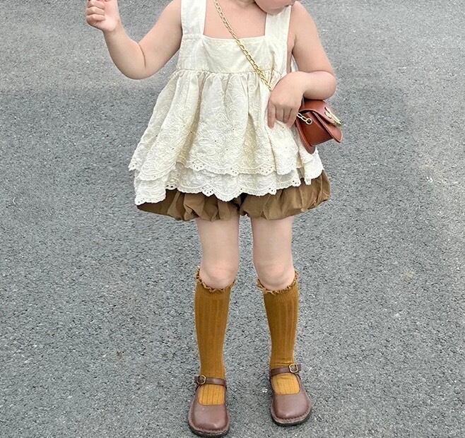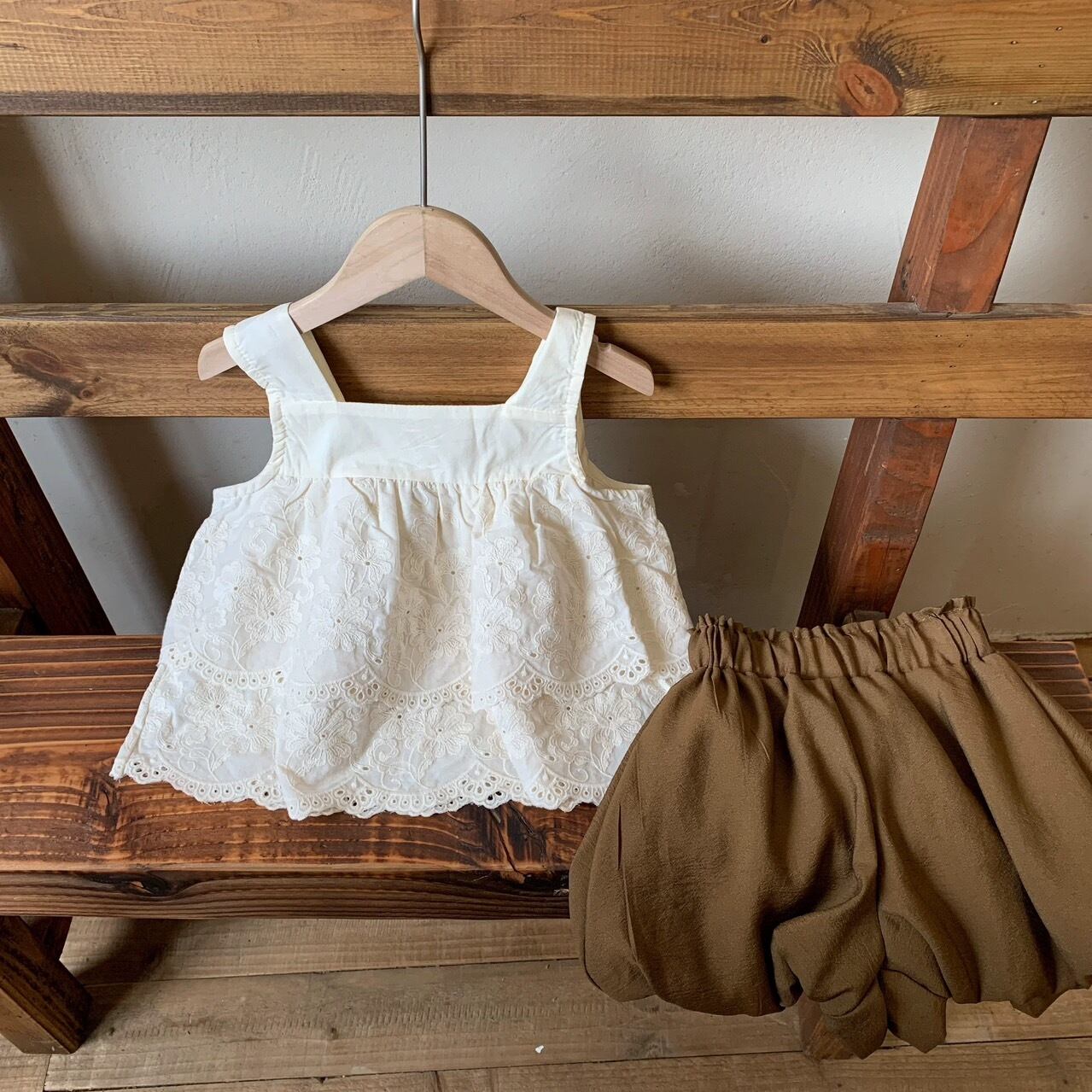 お花の刺繍を贅沢にあしらったティアードデザインのトップスと、ふんわりとした丸いフォルムが可愛らしいかぼちゃパンツのセットアイテムです。