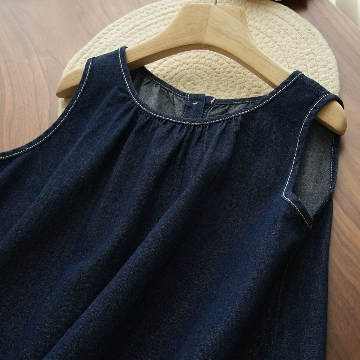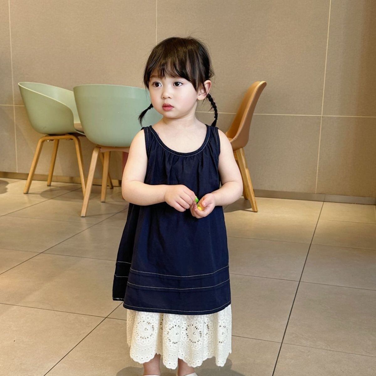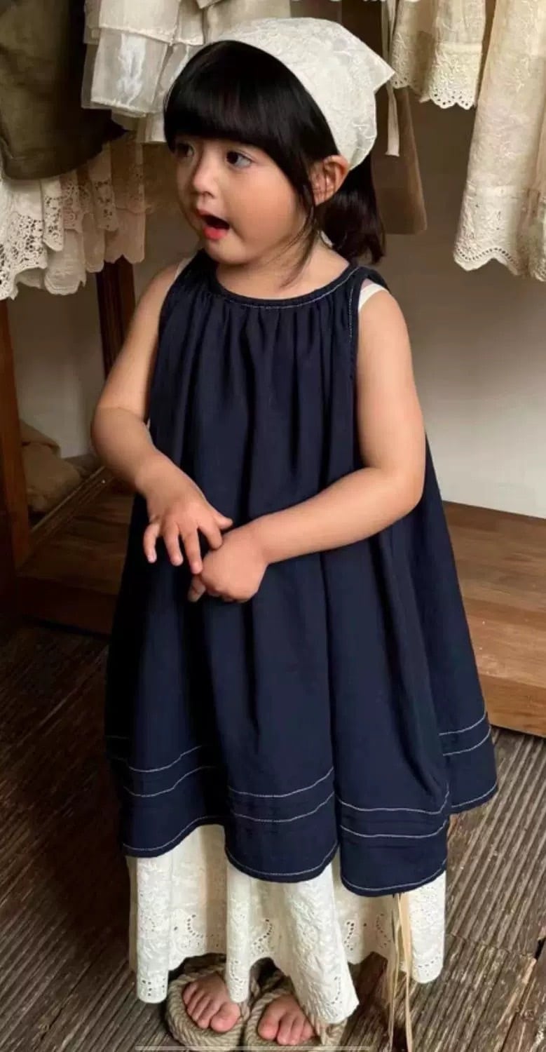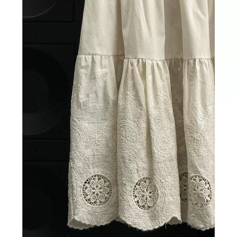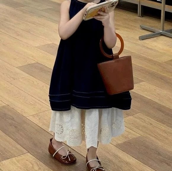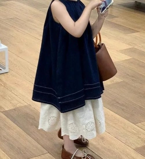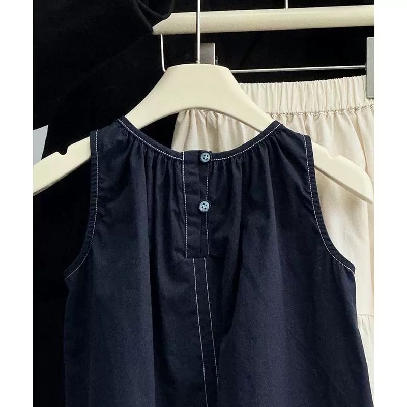 コントラストの効いたホワイトのステッチがアクセントになったノースリーブのトップスと、裾に贅沢なカットワークレースをあしらったティアードデザインのスカートのセットアップです。トップスは首元にギャザーが入り、バックスタイルはボタン留めの仕様になっています。スカートはふんわりとしたティアードシルエットで、裾の透かしレースが上品な印象を与えます。