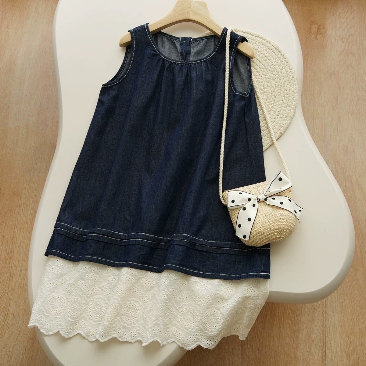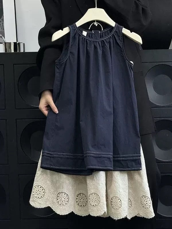 ステッチ入りノースリーブトップス&裾カットワークレーススカート セットアップ