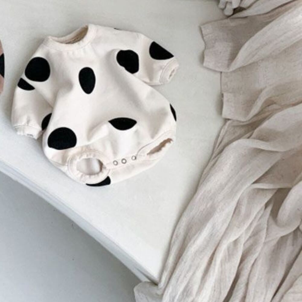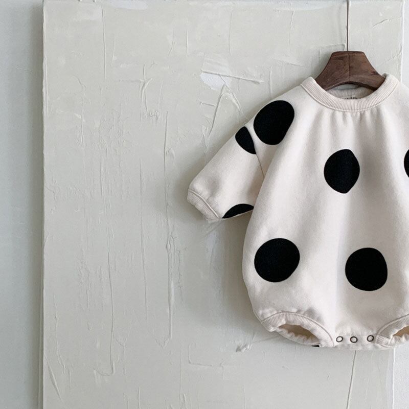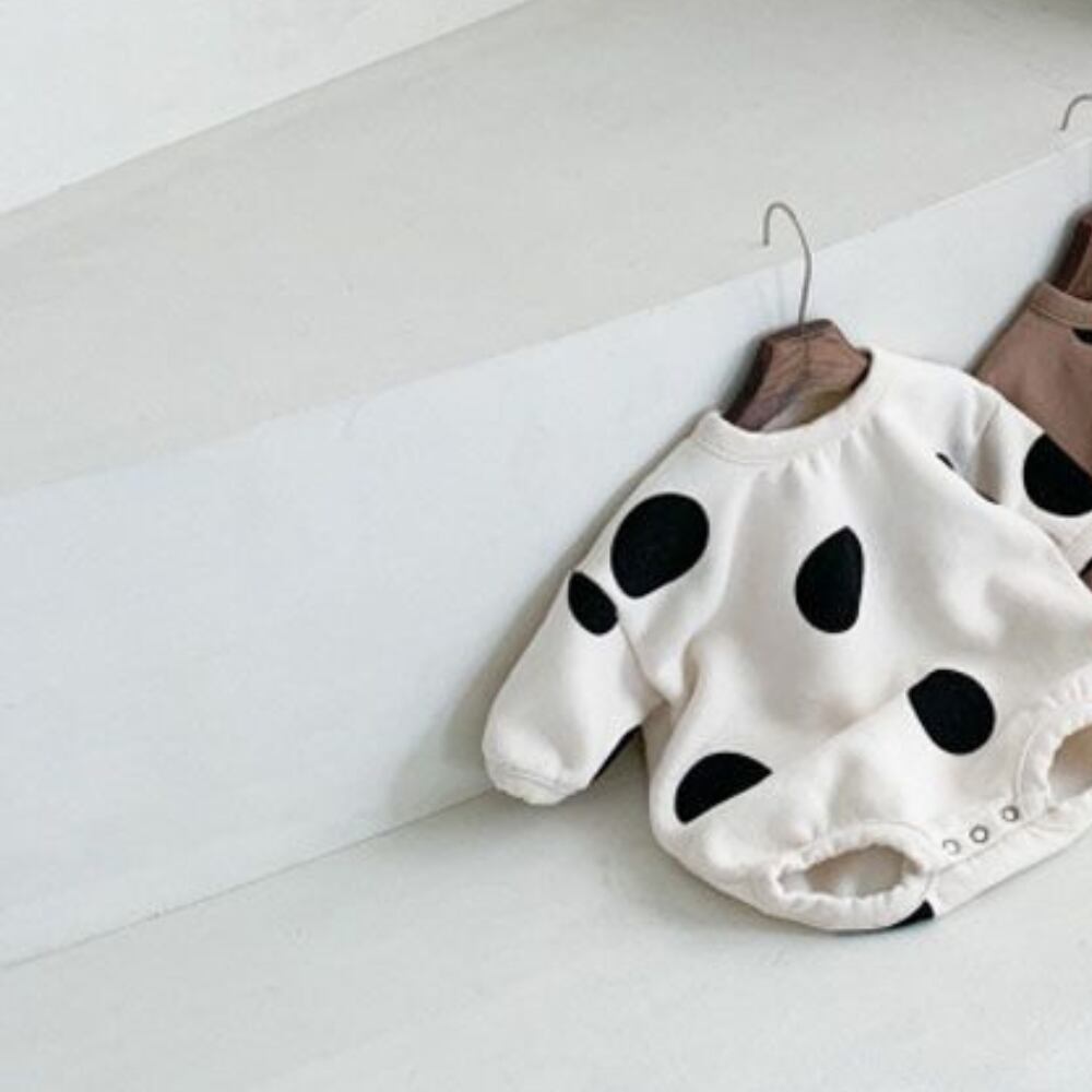 大きめのドットがパッと目を引く、シルエットが可愛らしいロンパースです。