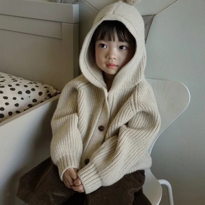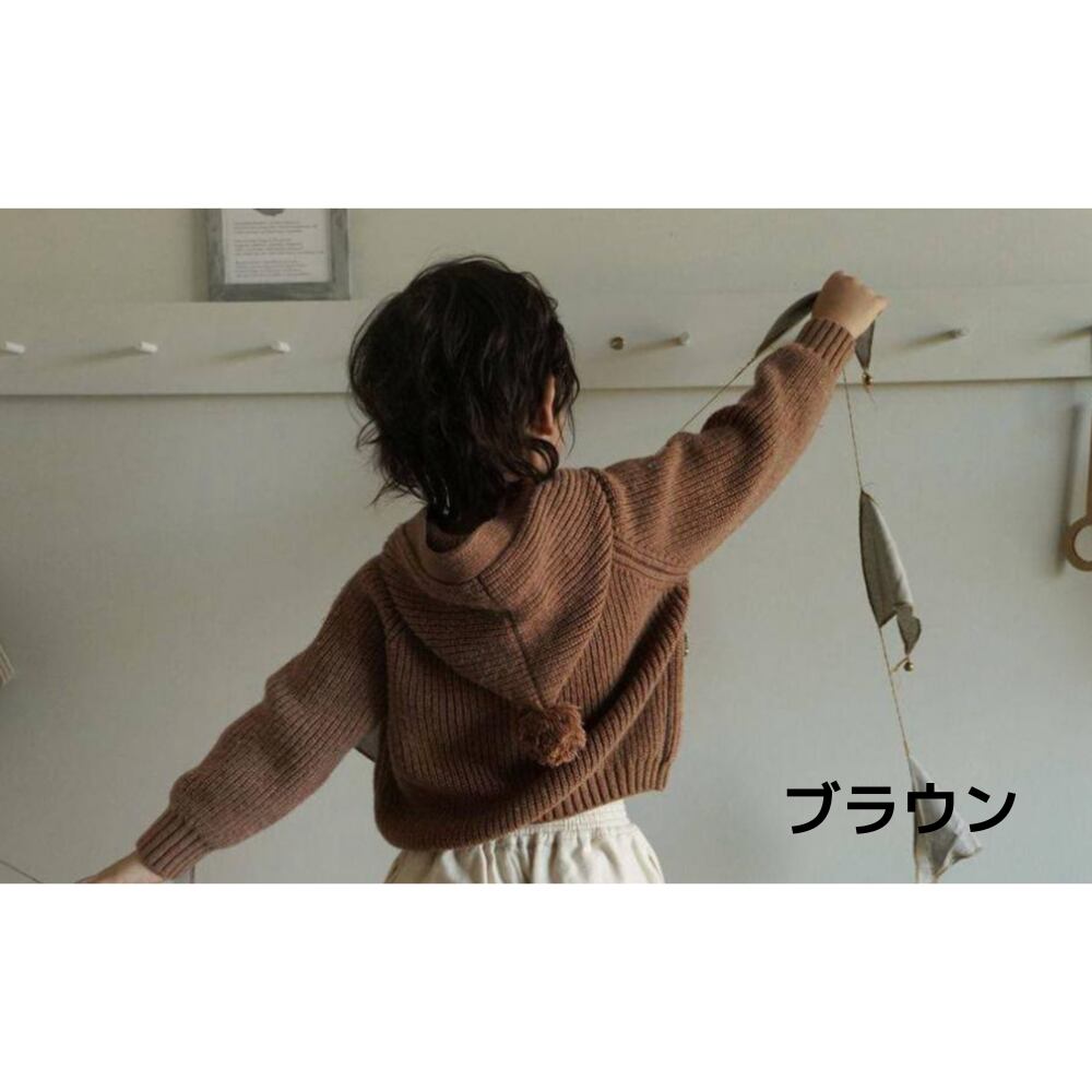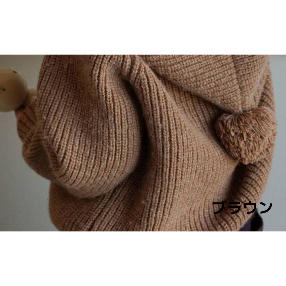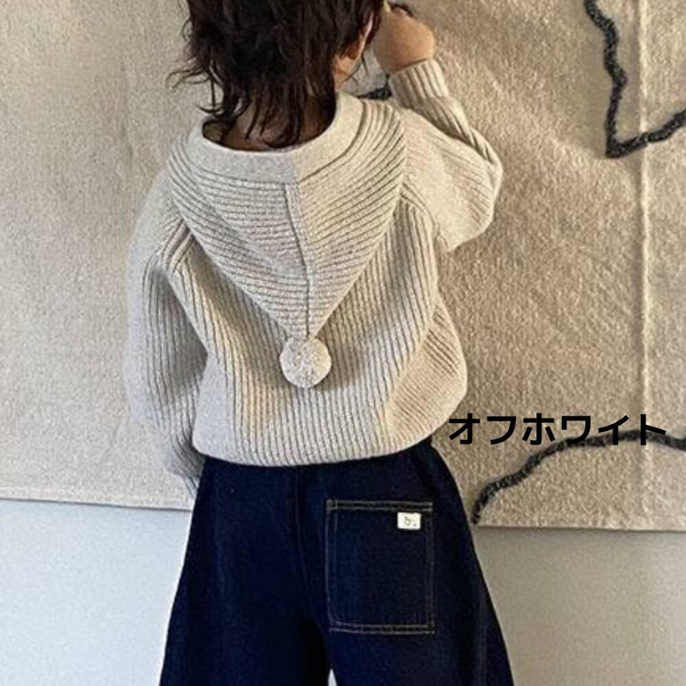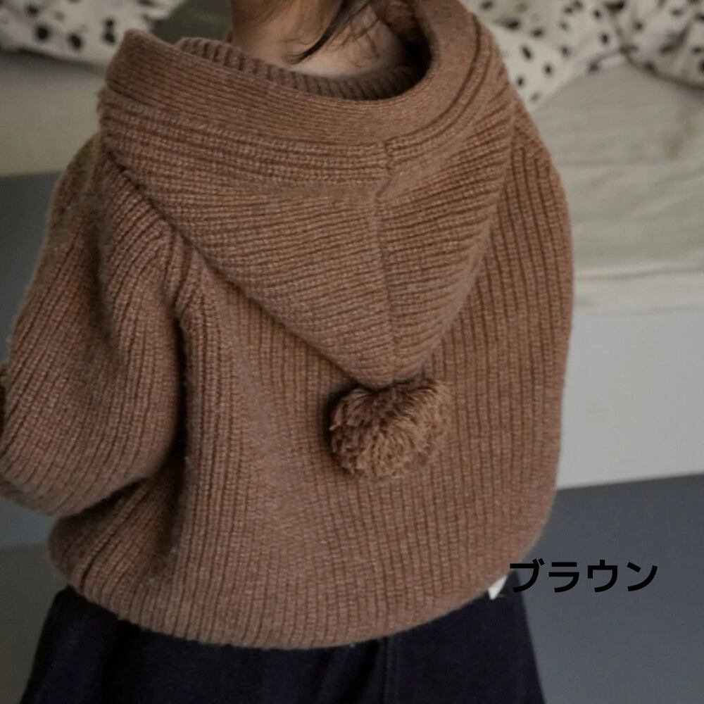 ぴょこんとついた耳付きフードが可愛らしい、ざっくり編みのニットカーディガンです。