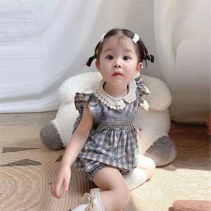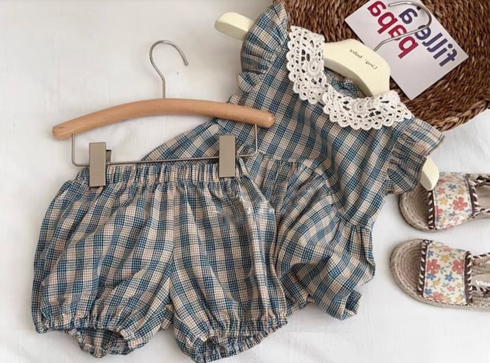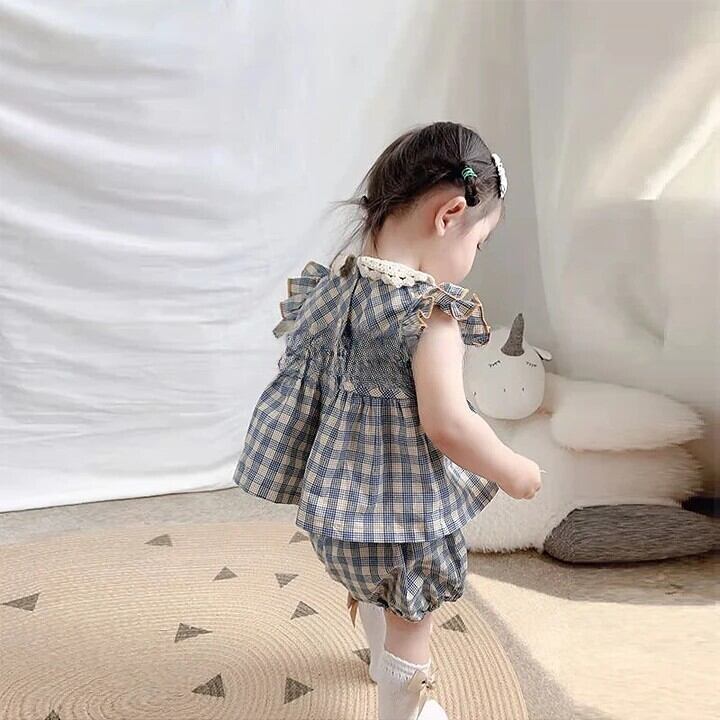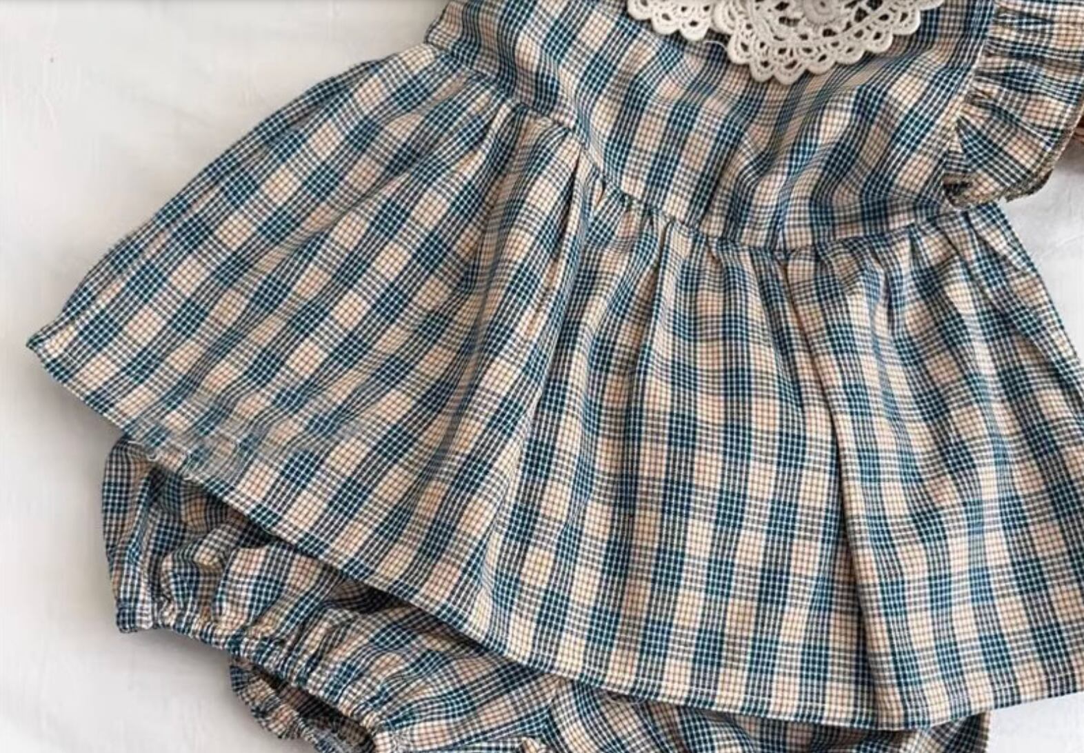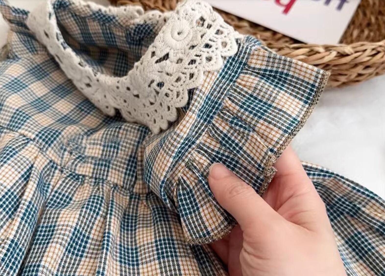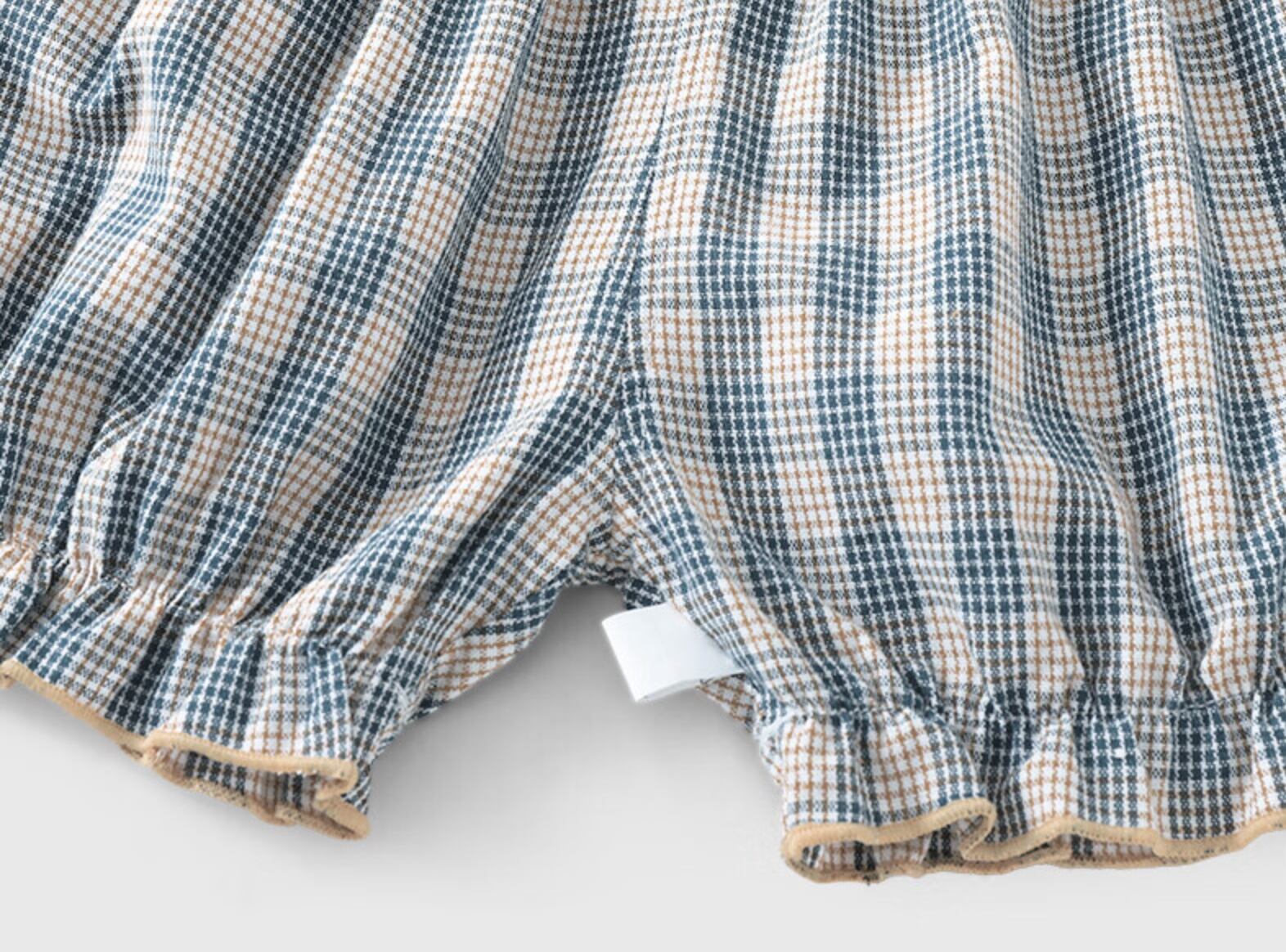 爽やかなブルーとベージュを掛け合わせたチェック柄に、フリル袖が可愛らしいアクセント。素材は肌に優しい綿を使用しており、汗ばむ季節でもさらりと快適に、安心してお召しいただけます。