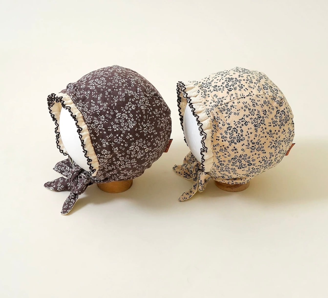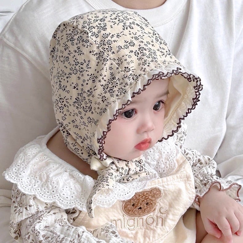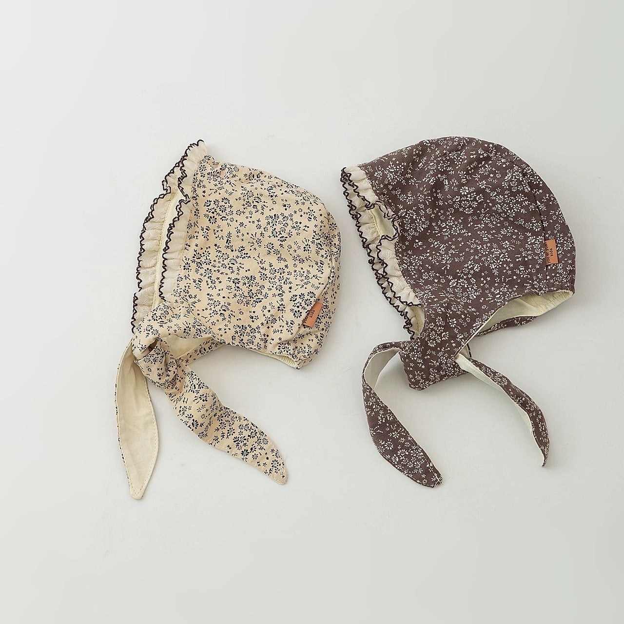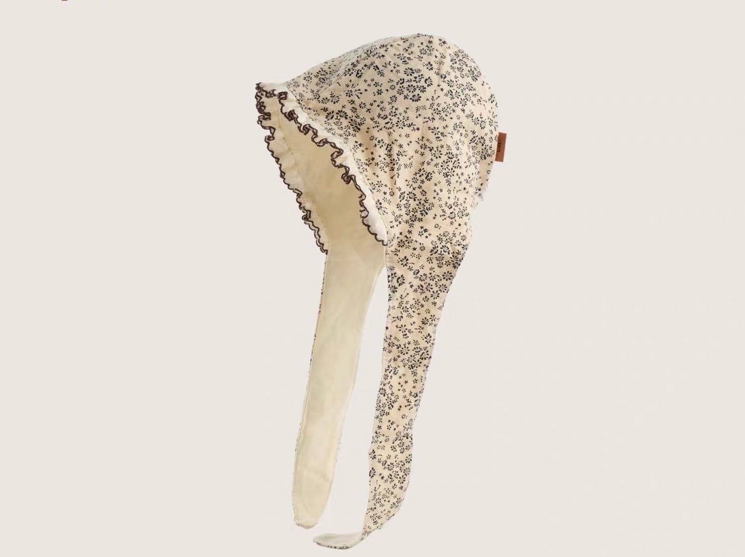 お顔周りに施された繊細なフリルが赤ちゃんの愛らしさを引き立て、ヴィンテージ感のある上品な雰囲気を演出します。お出かけの際に注目を集めるような、おしゃれで実用的なデザインが特徴です。