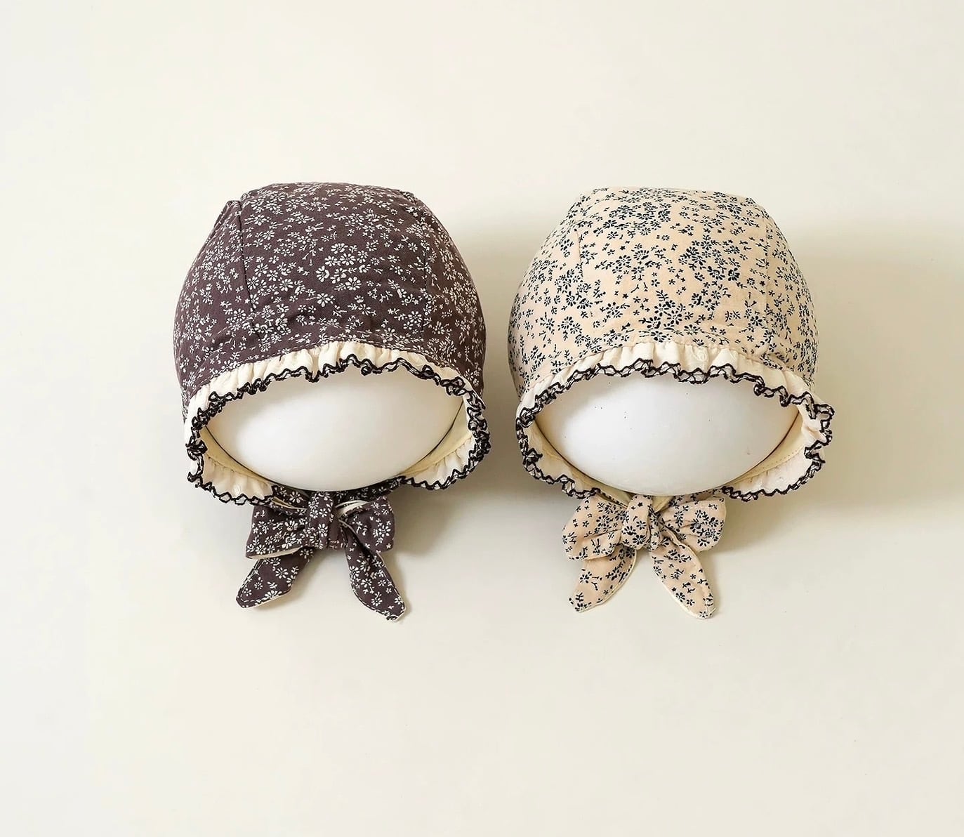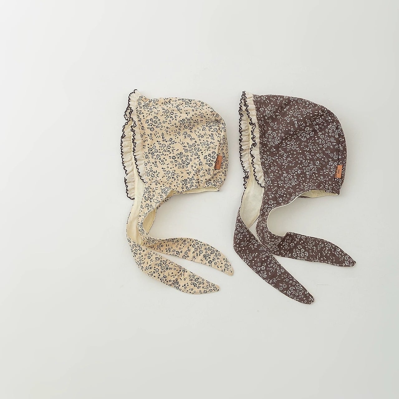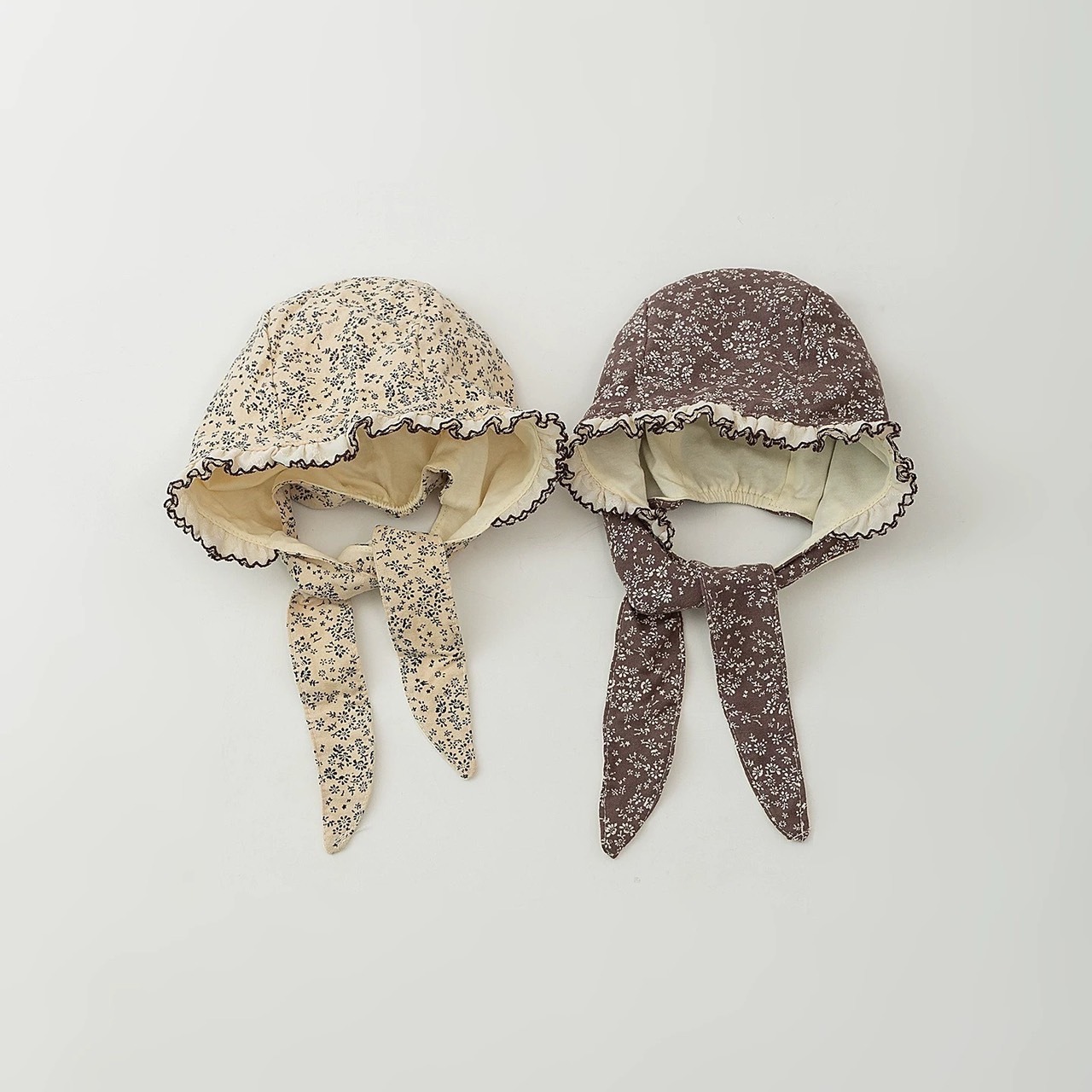 お顔周りに施された繊細なフリルが赤ちゃんの愛らしさを引き立て、ヴィンテージ感のある上品な雰囲気を演出します。お出かけの際に注目を集めるような、おしゃれで実用的なデザインが特徴です。