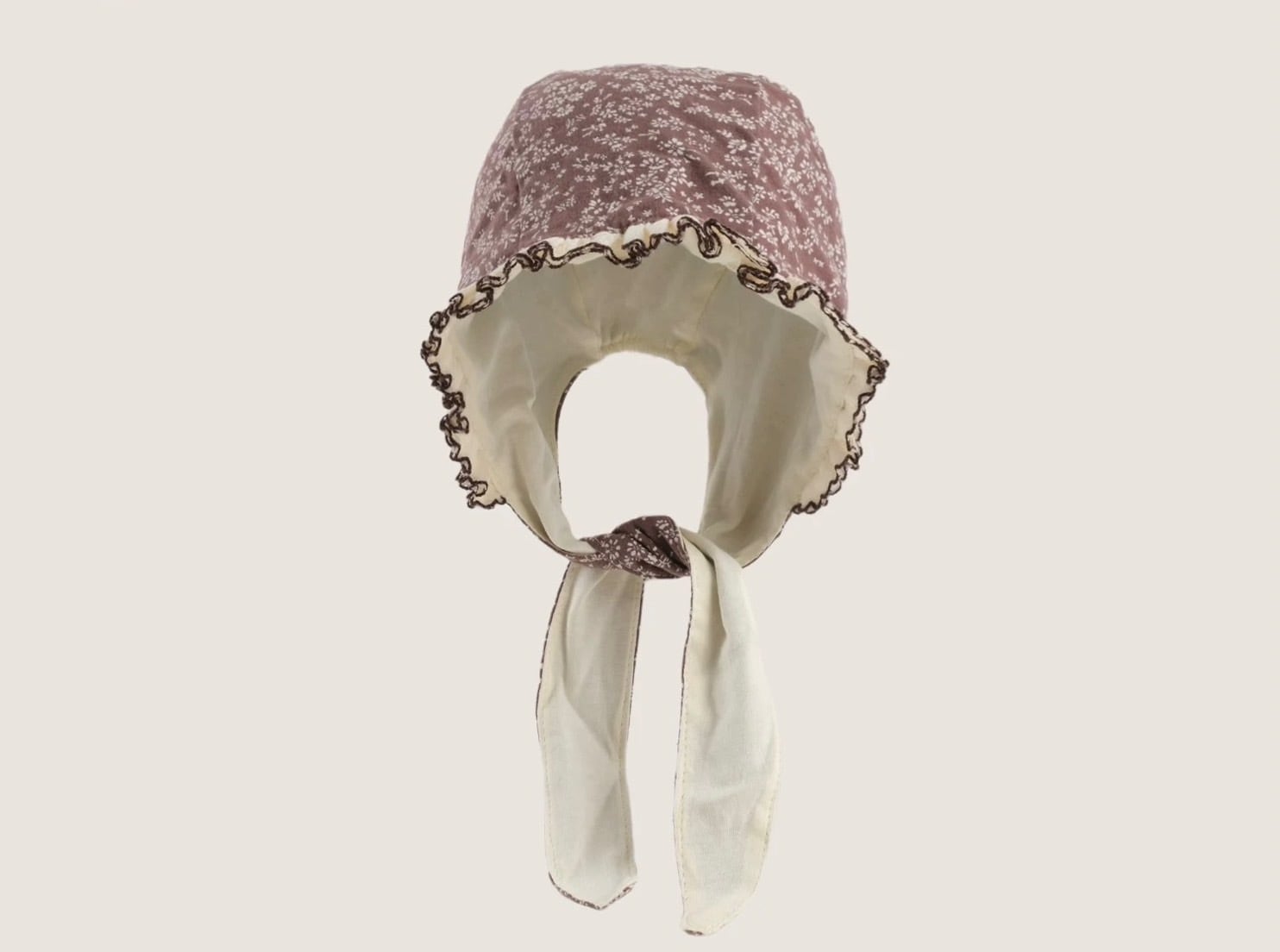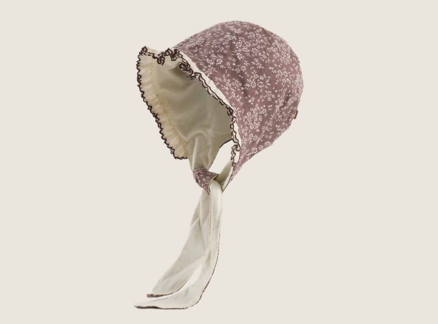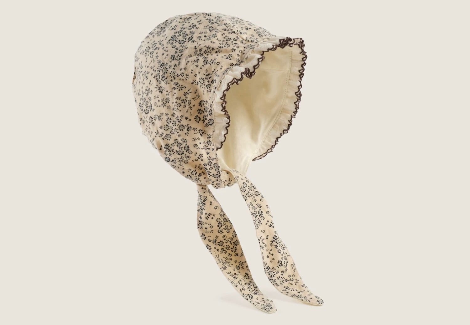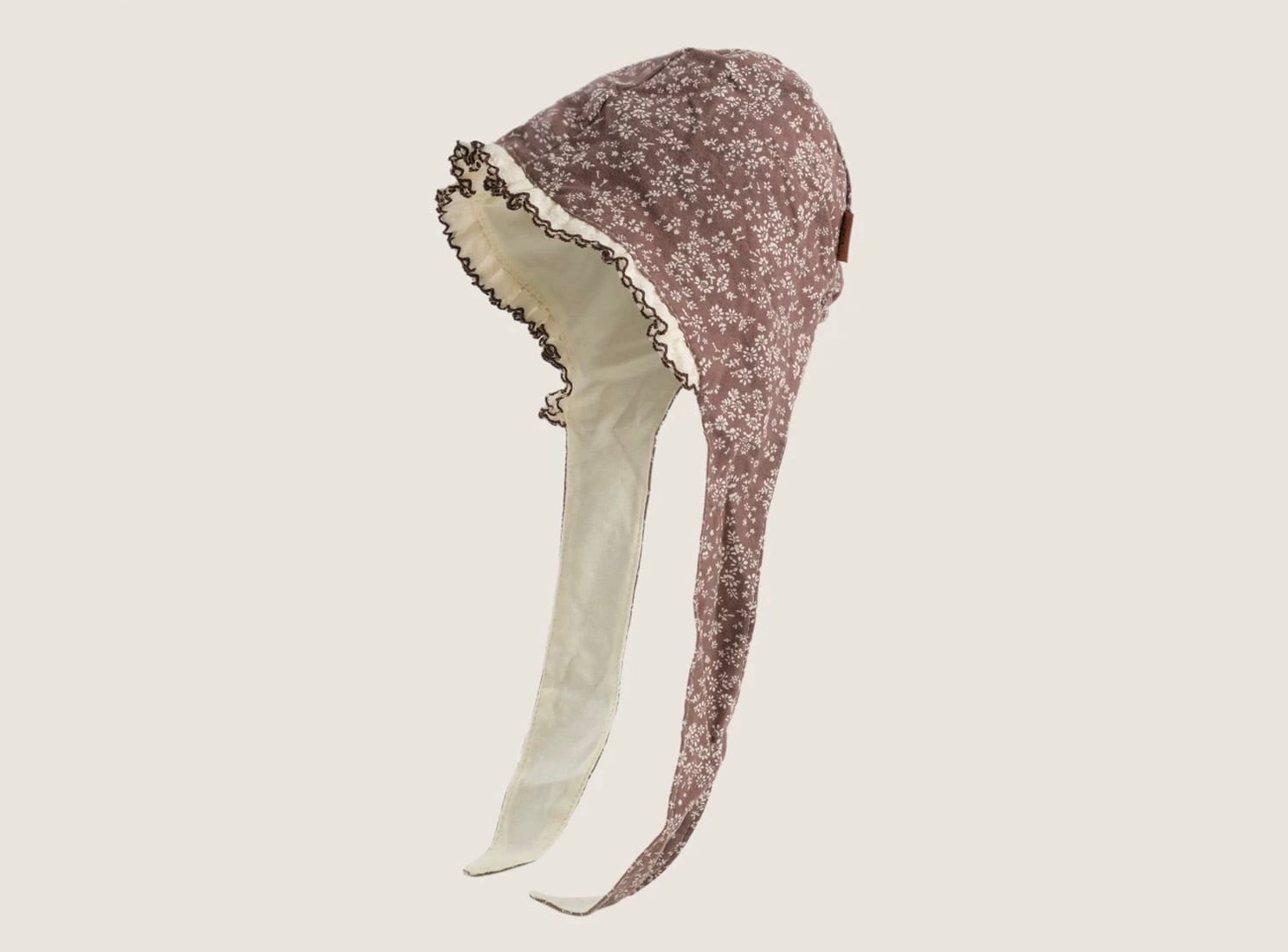 お顔周りに施された繊細なフリルが赤ちゃんの愛らしさを引き立て、ヴィンテージ感のある上品な雰囲気を演出します。お出かけの際に注目を集めるような、おしゃれで実用的なデザインが特徴です。