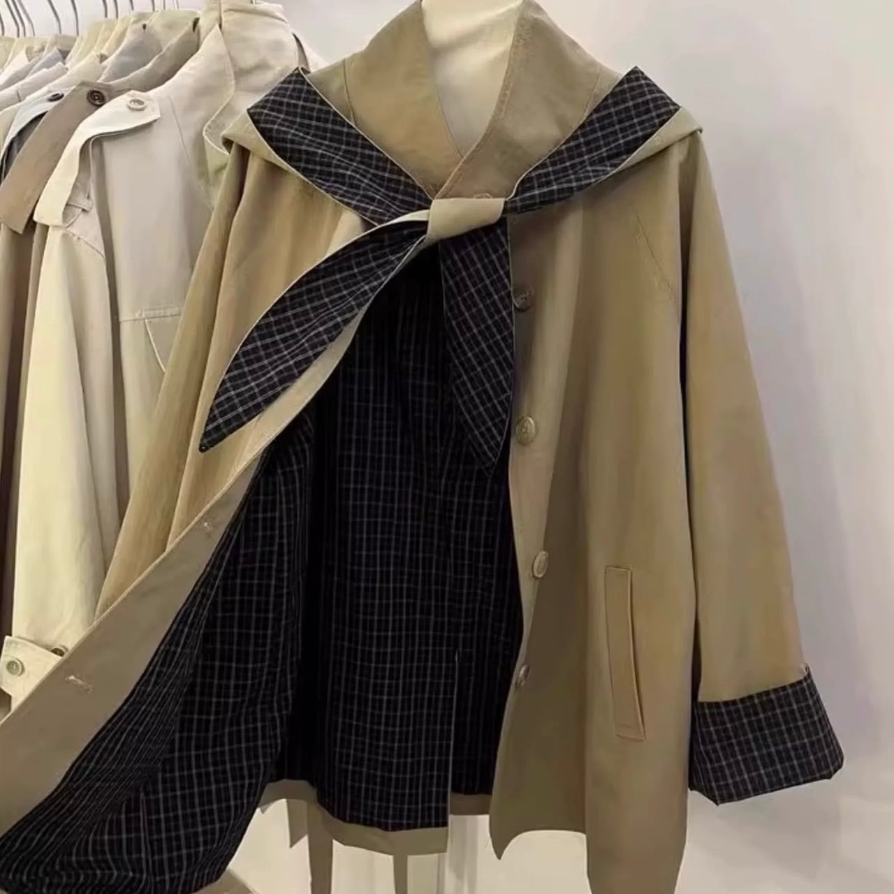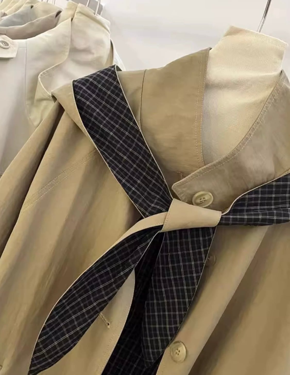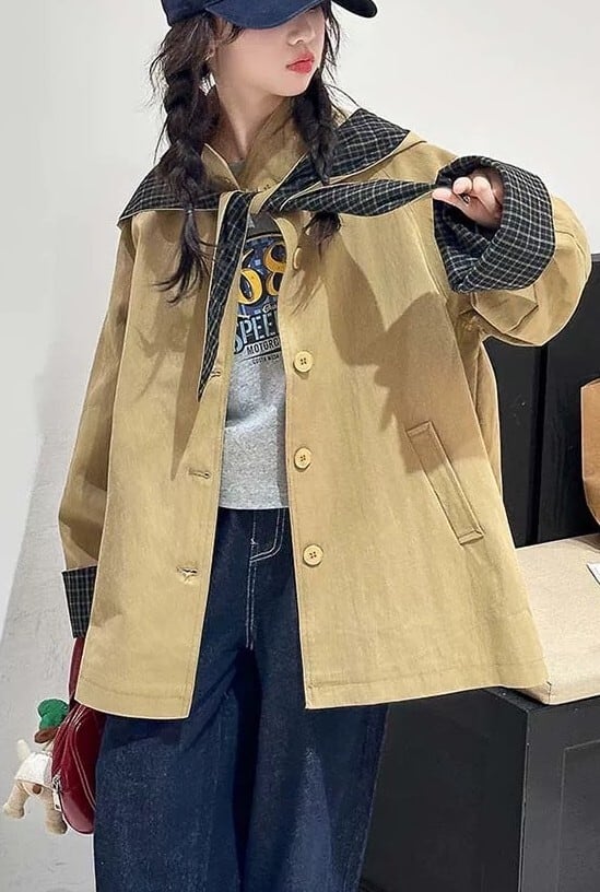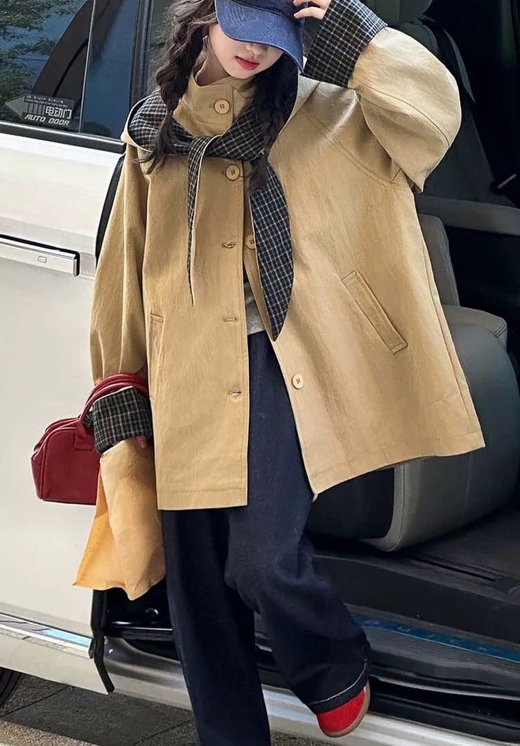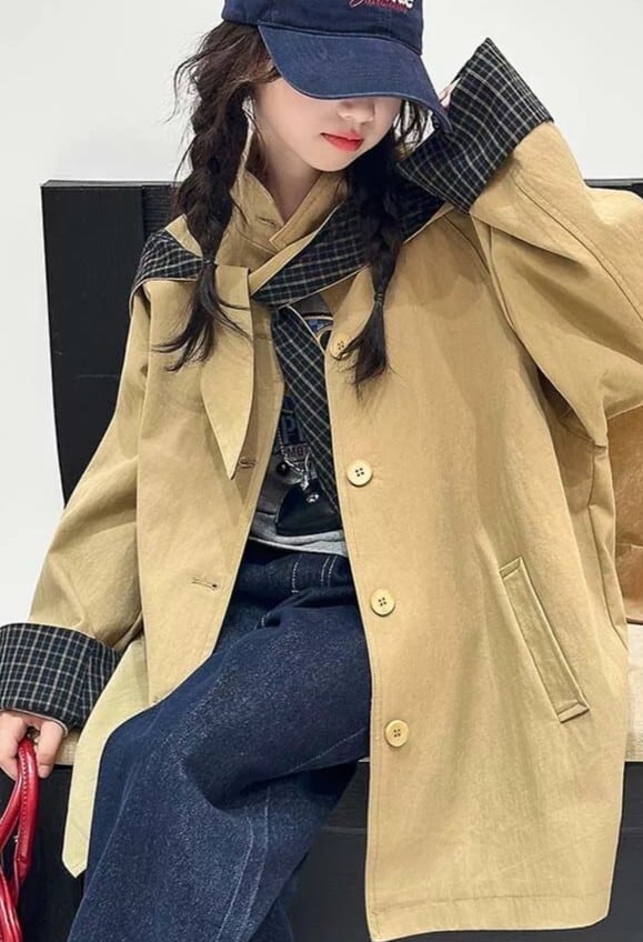 取り外し可能なフード付き チェック柄アクセントのルーズトレンチコート