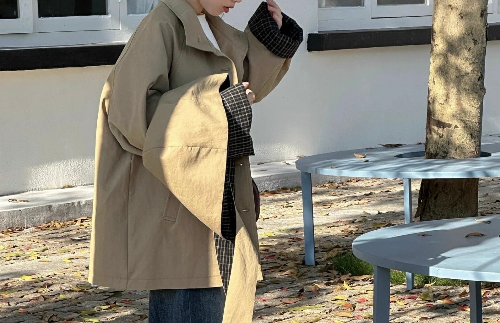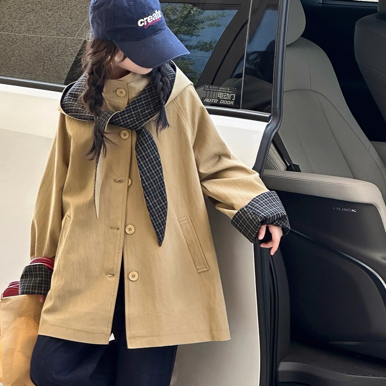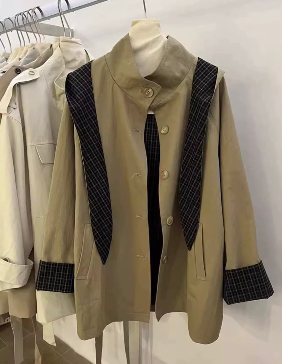 取り外し可能なフード付き チェック柄アクセントのルーズトレンチコート