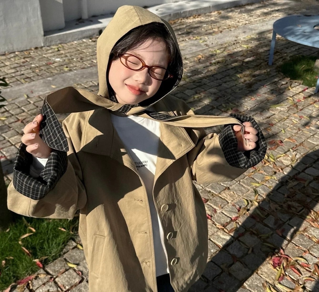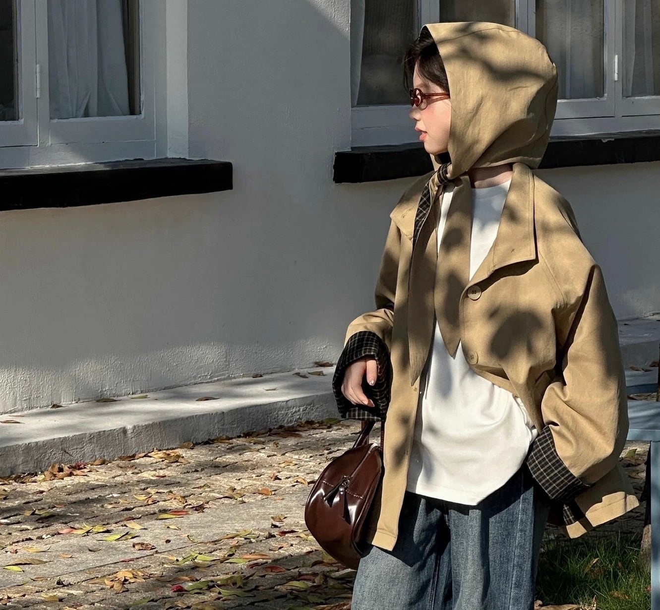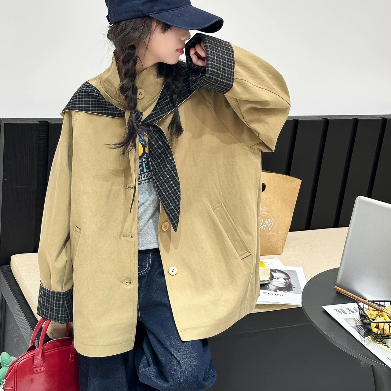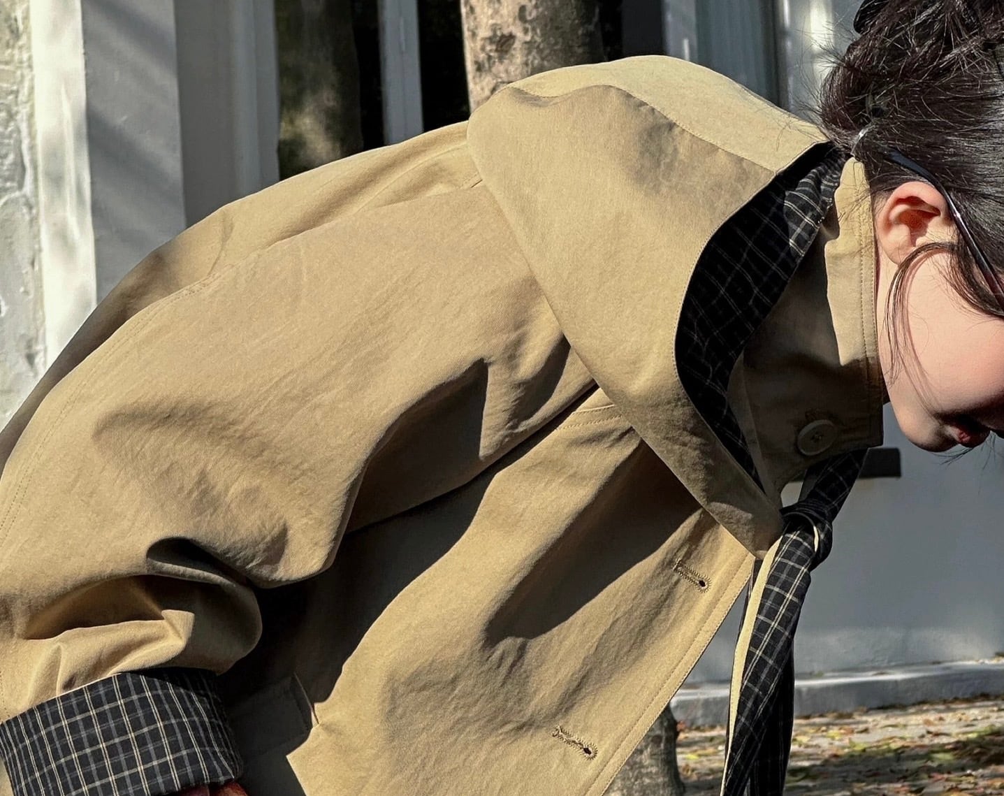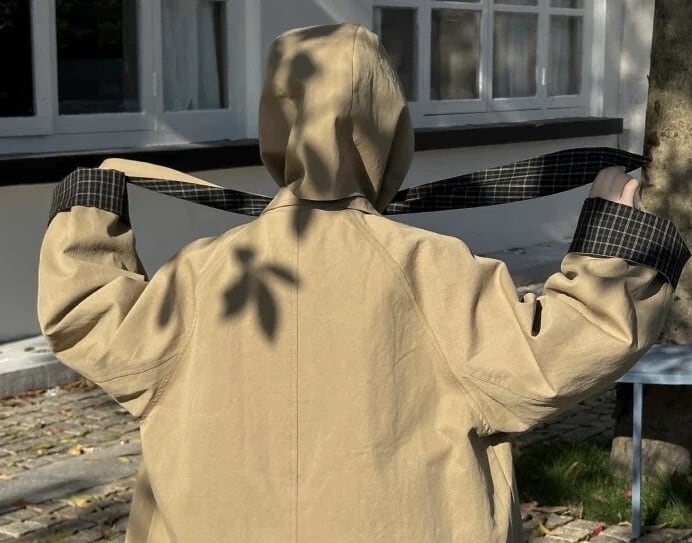 最大の特徴は取り外し可能なフードで、その日の気分やコーディネートに合わせてスタイルを変えることができます。また、袖口、裏地、フードにあしらわれたチェック柄が、クラシックでおしゃれなアクセントになっています。