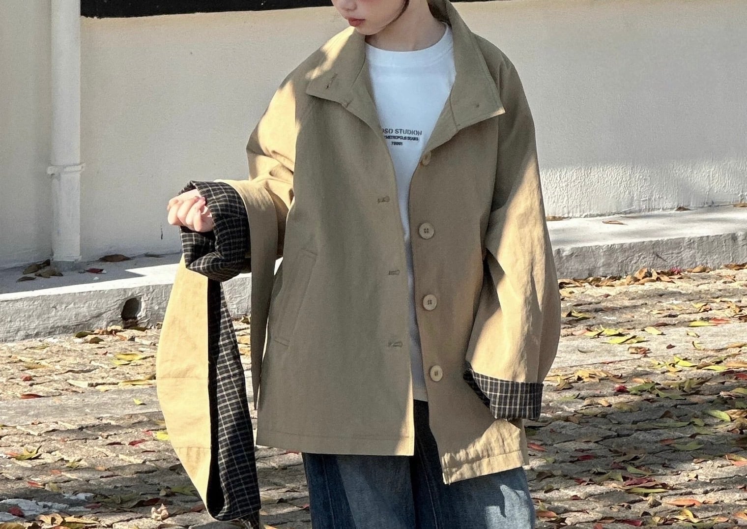 ボタンを閉めてもハイネックデザインで着ても、開けてベーシックなトレンチコート風に着こなしても気分やその日のコーディネートで雰囲気を変えることができるのも魅力なアイテムです。