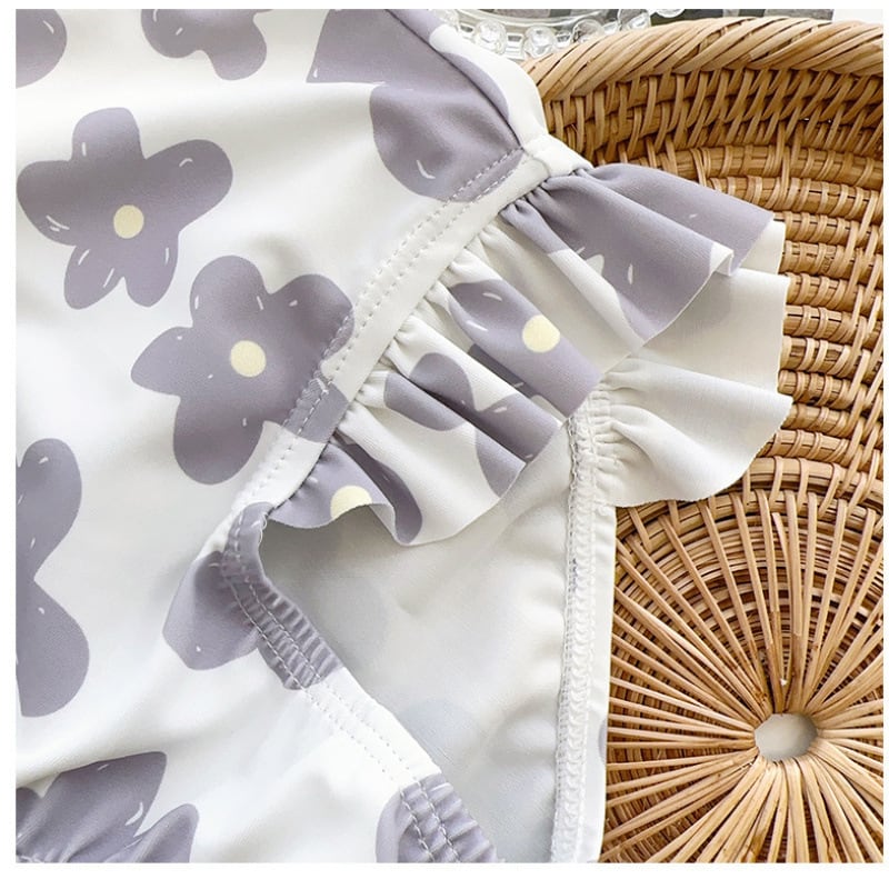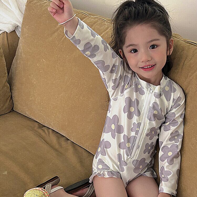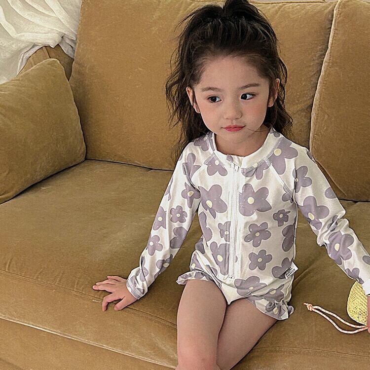 落ち着いたパープルのニュアンスカラーに、大きな北欧風のお花柄が映える、とってもおしゃれな長袖水着です。