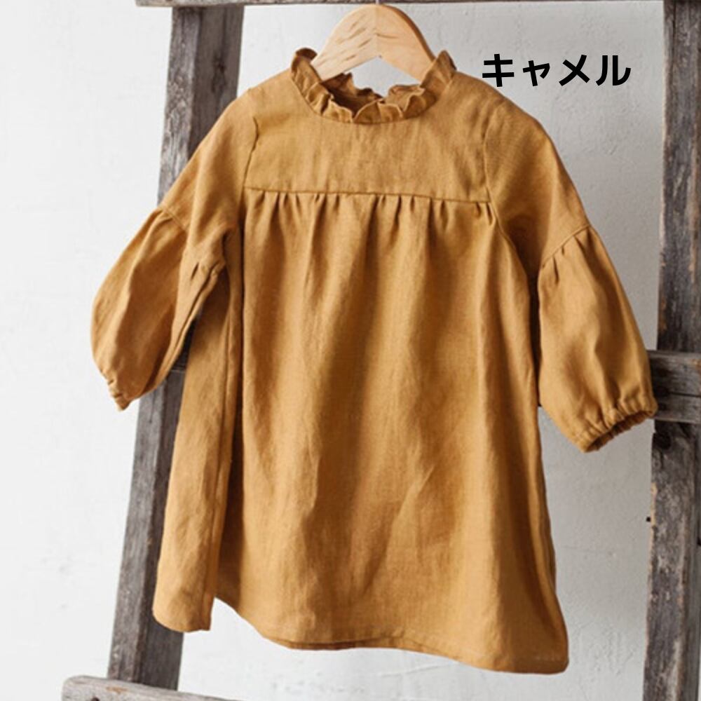 首元の控えめなフリルと、袖口にゴムを入れた「ぽわん」と可愛いパフスリーブが、お子様の愛らしさを引き立てます。素材は肌に優しい綿。通気性が良く、さらりとした質感なので、春先や秋口の1枚着として心地よくお召しいただけます。