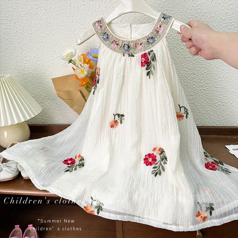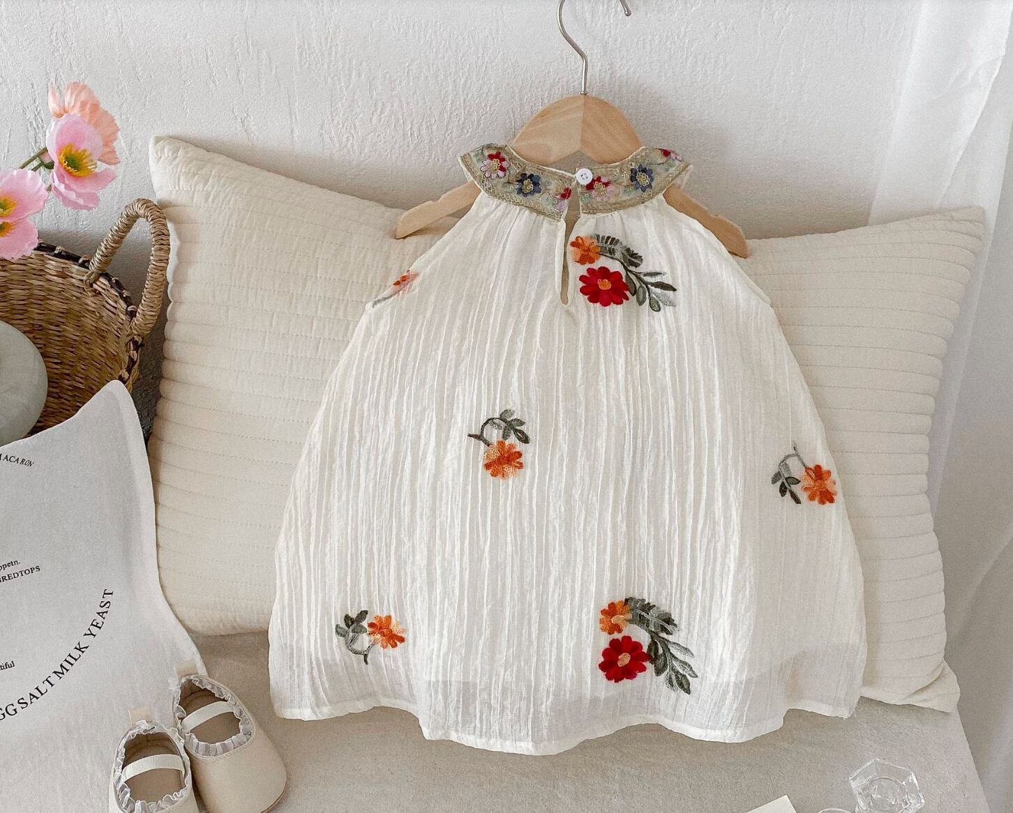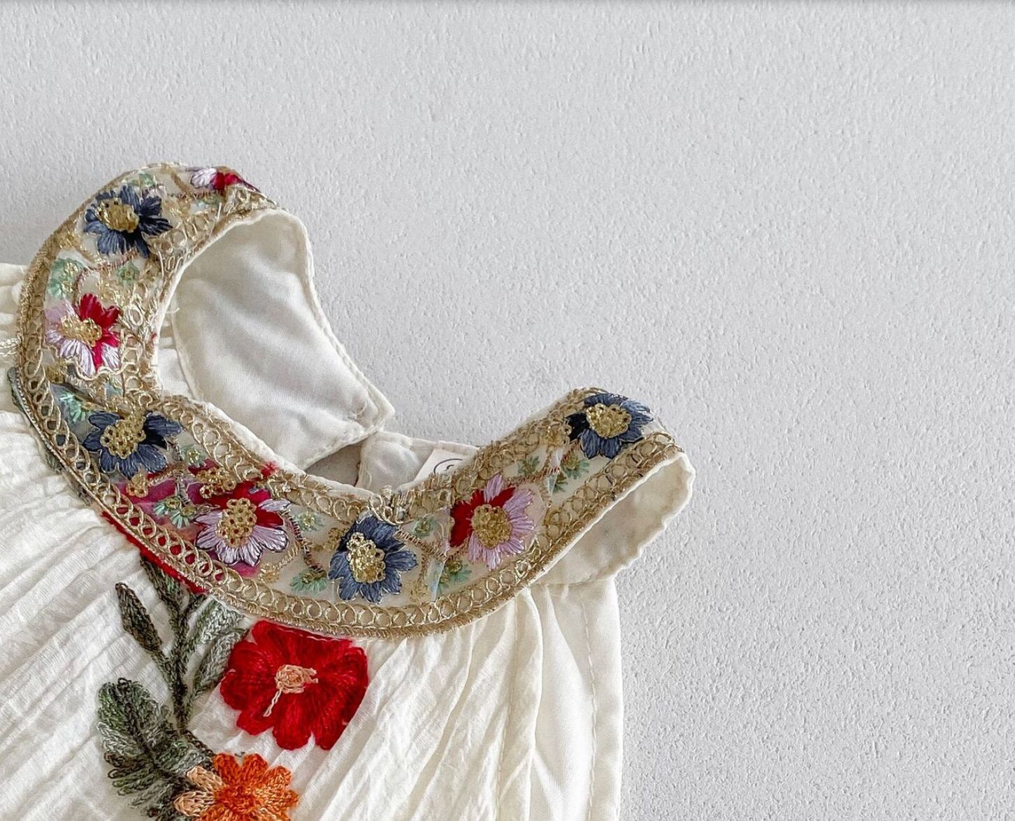 一番のポイントは、襟元にあしらわれた宝石のようなビジュー刺繍。光を反射してキラキラと輝き、お子様の笑顔をより一層明るく引き立てます。スカート部分には、赤やオレンジの鮮やかなお花と、生き生きとした葉の刺繍が散りばめられ、まるで春の庭園のような可憐な雰囲気を演出します。