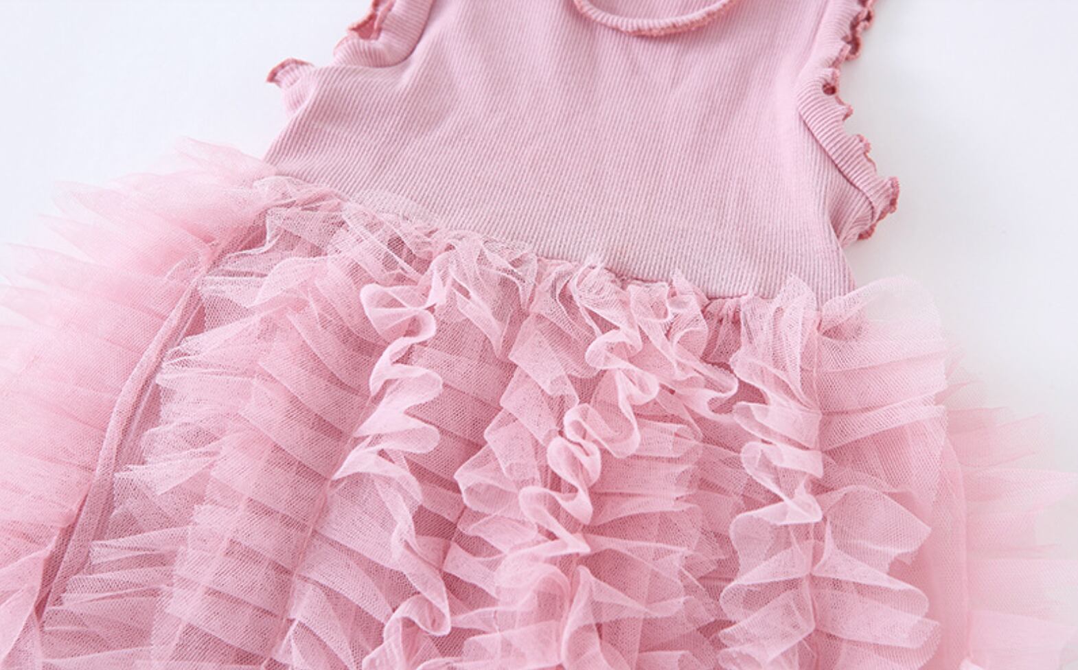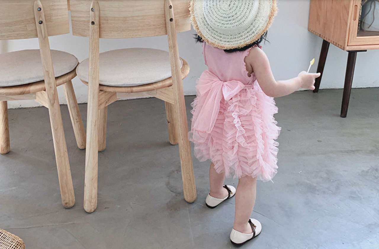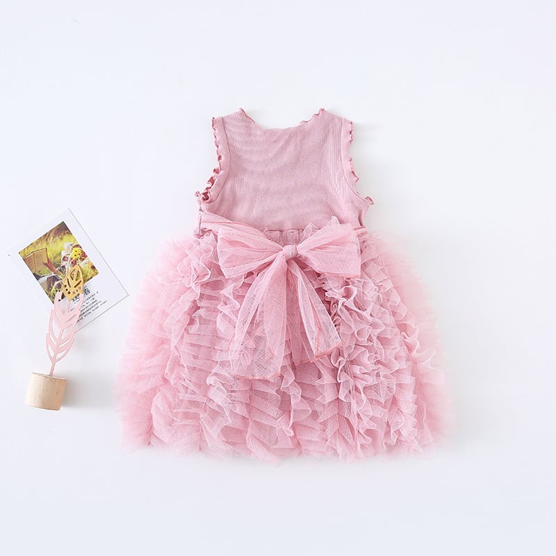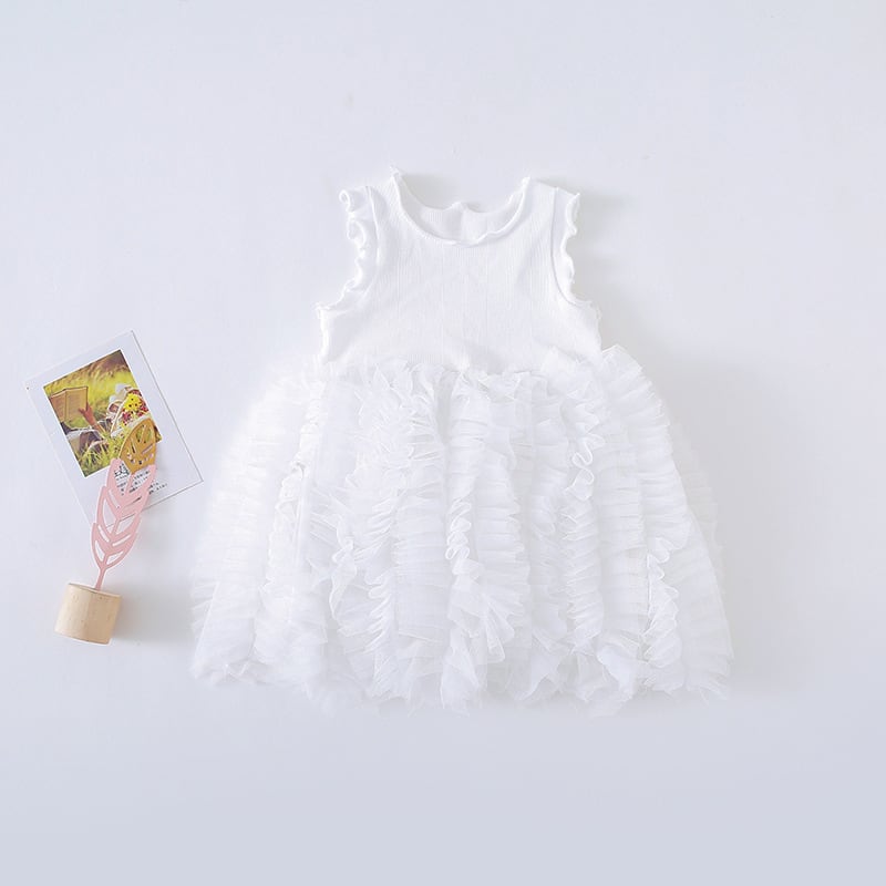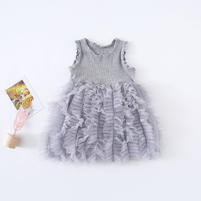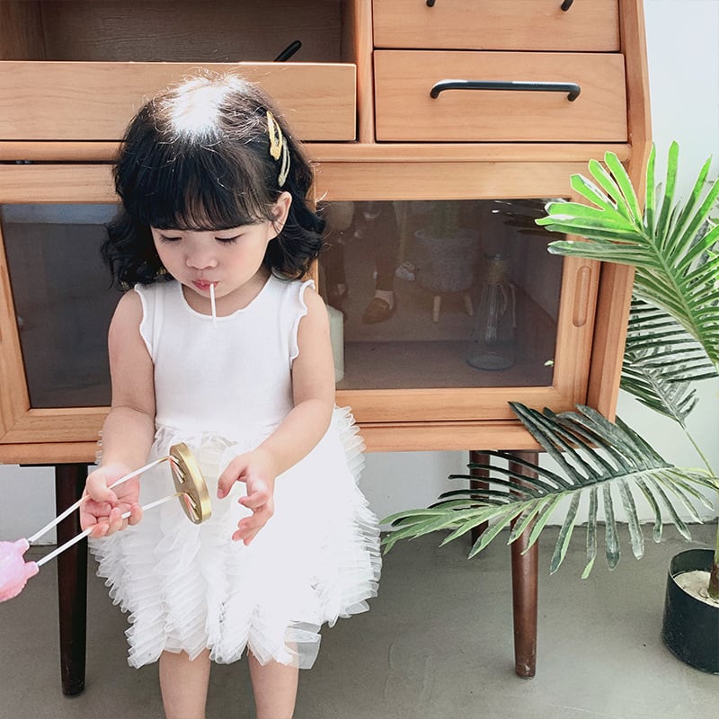 ふんわり重なるフリルスカートが女の子らしさを引き立てる、チュールフリルノースリーブワンピースです。上身頃はシンプルなリブニット素材で、すっきりとしたシルエットに仕上がっています。スカート部分にはたっぷりのチュールフリルが何段にも重なり、動くたびにふわりと揺れる華やかなデザインです。ナチュラルで甘すぎない色合いが、おしゃれな雰囲気を演出してくれます。
