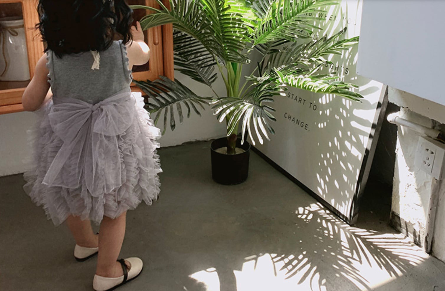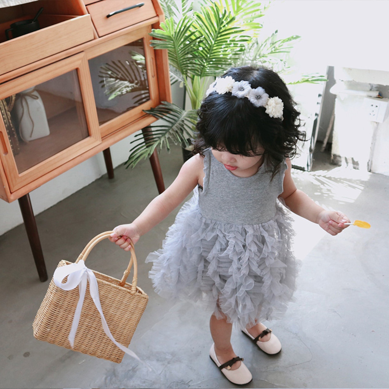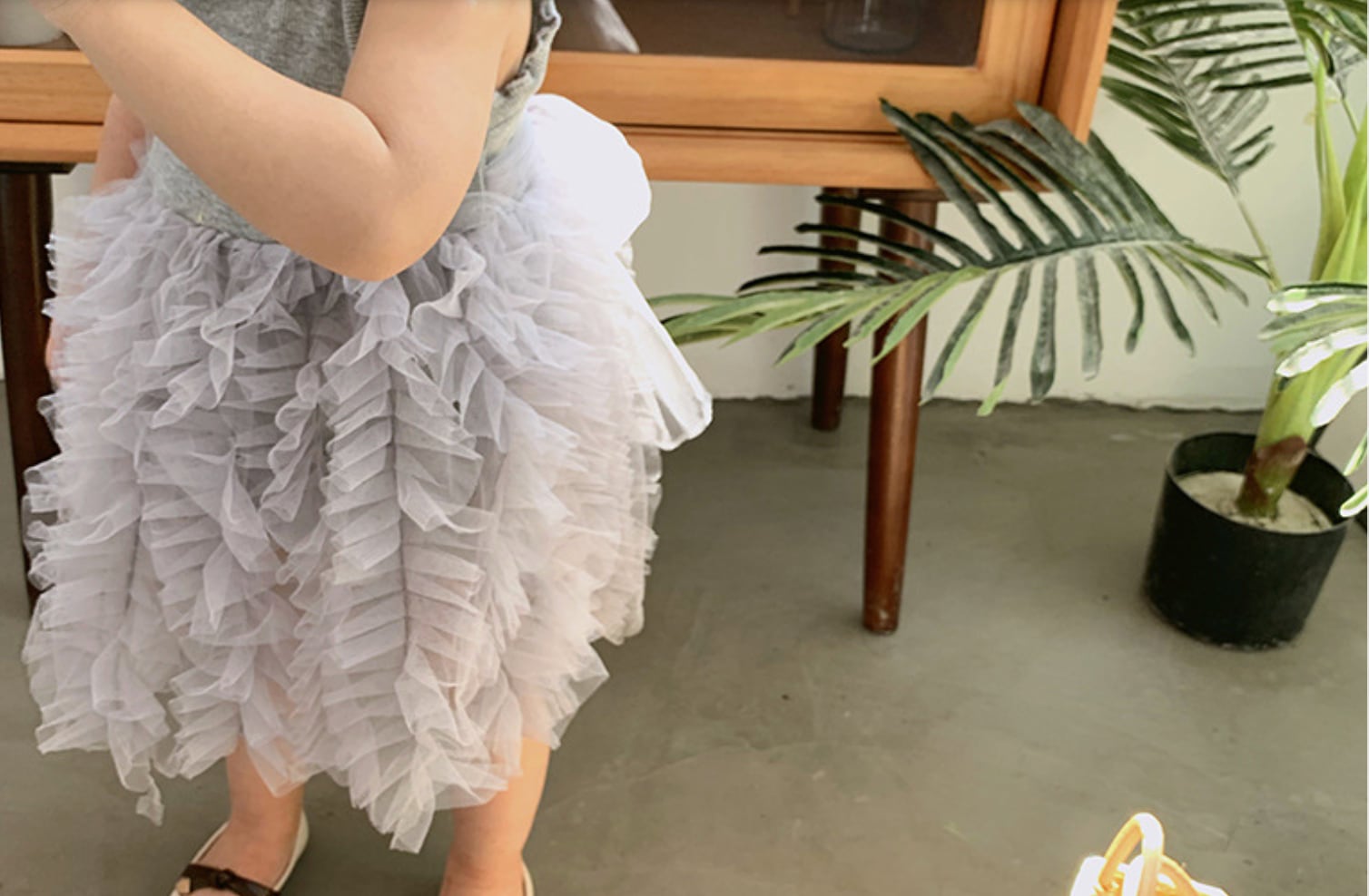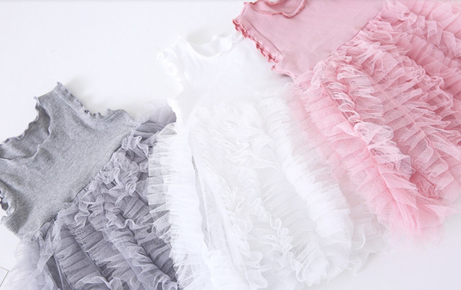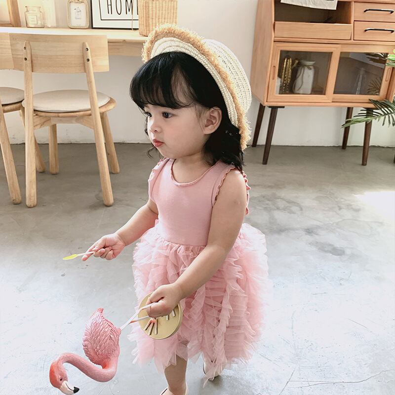 ふんわり重なるフリルスカートが女の子らしさを引き立てる、チュールフリルノースリーブワンピースです。上身頃はシンプルなリブニット素材で、すっきりとしたシルエットに仕上がっています。スカート部分にはたっぷりのチュールフリルが何段にも重なり、動くたびにふわりと揺れる華やかなデザインです。ナチュラルで甘すぎない色合いが、おしゃれな雰囲気を演出してくれます。