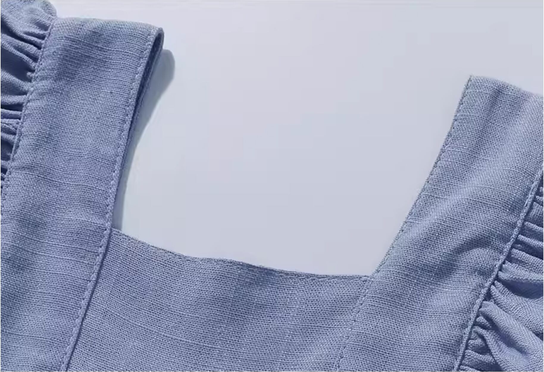 ふんわり広がるシルエットと、肩のフリルが目を引く