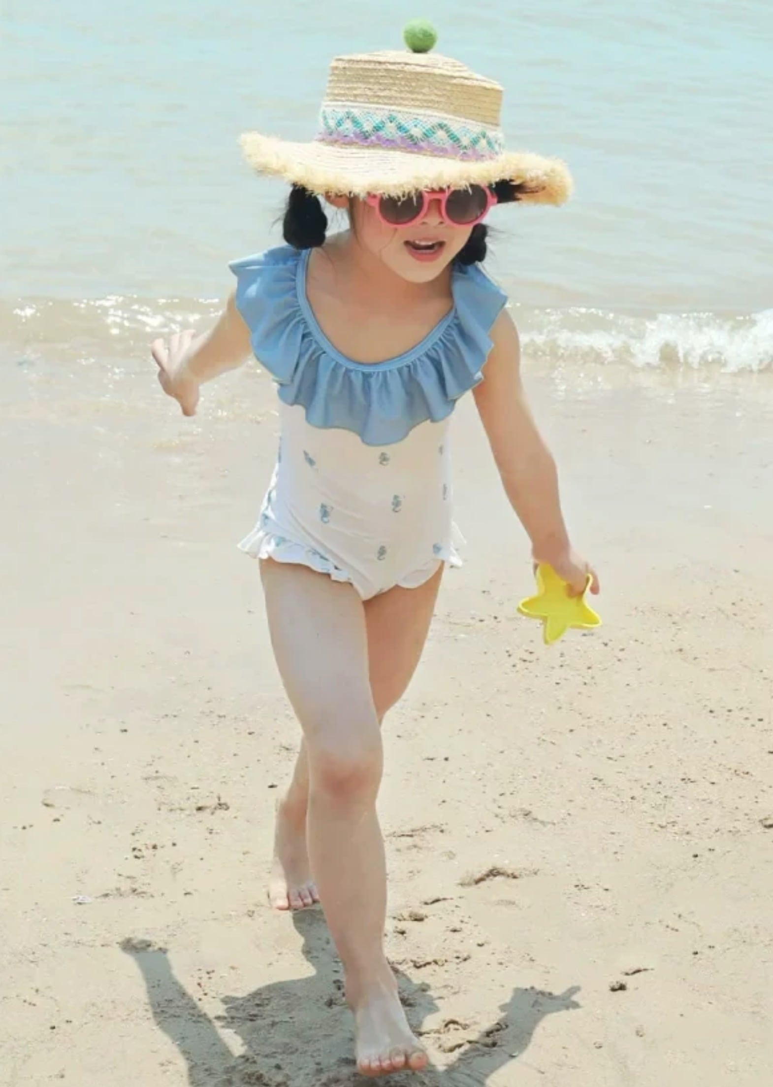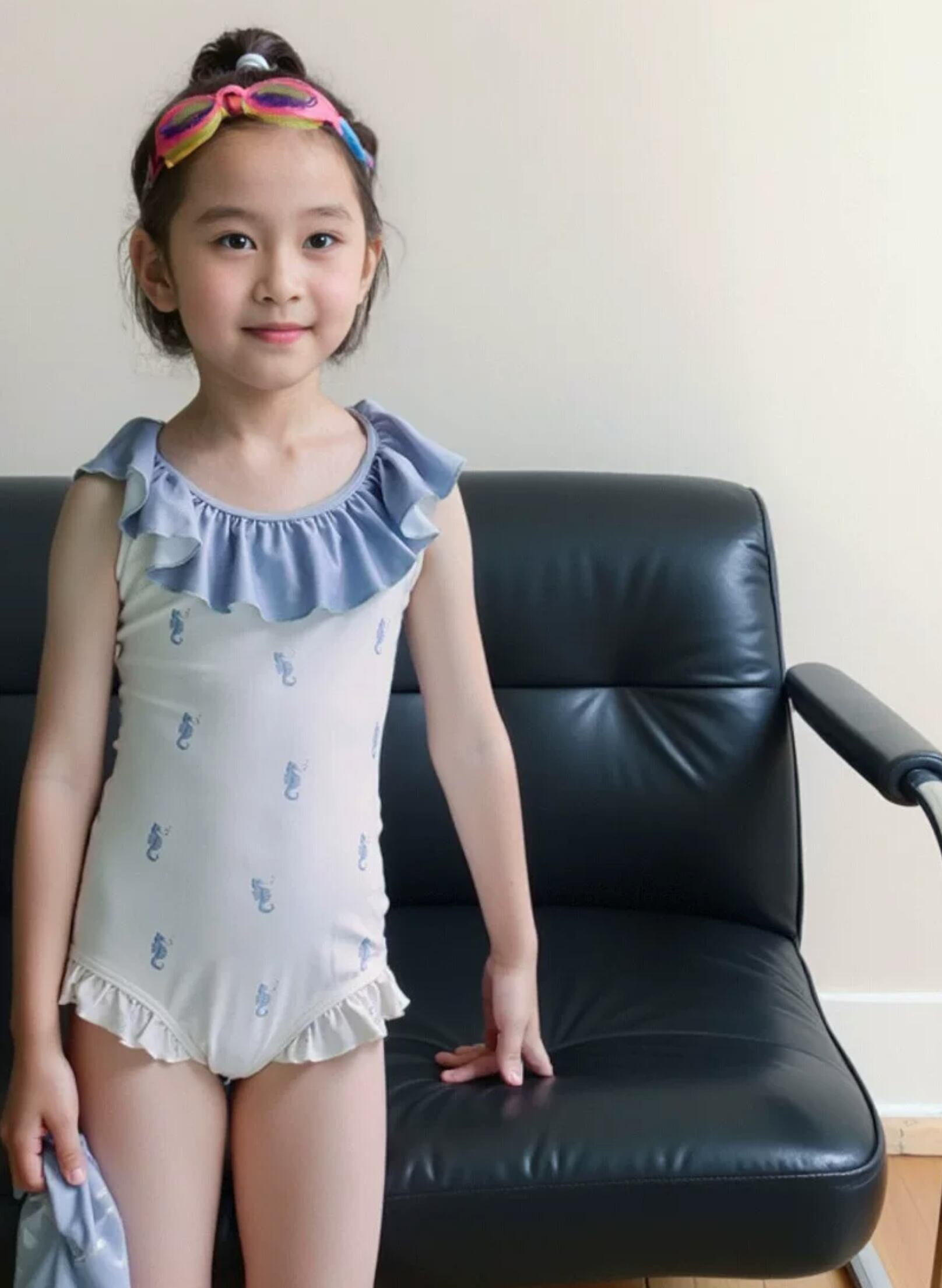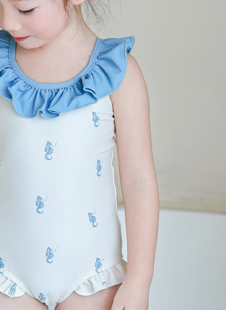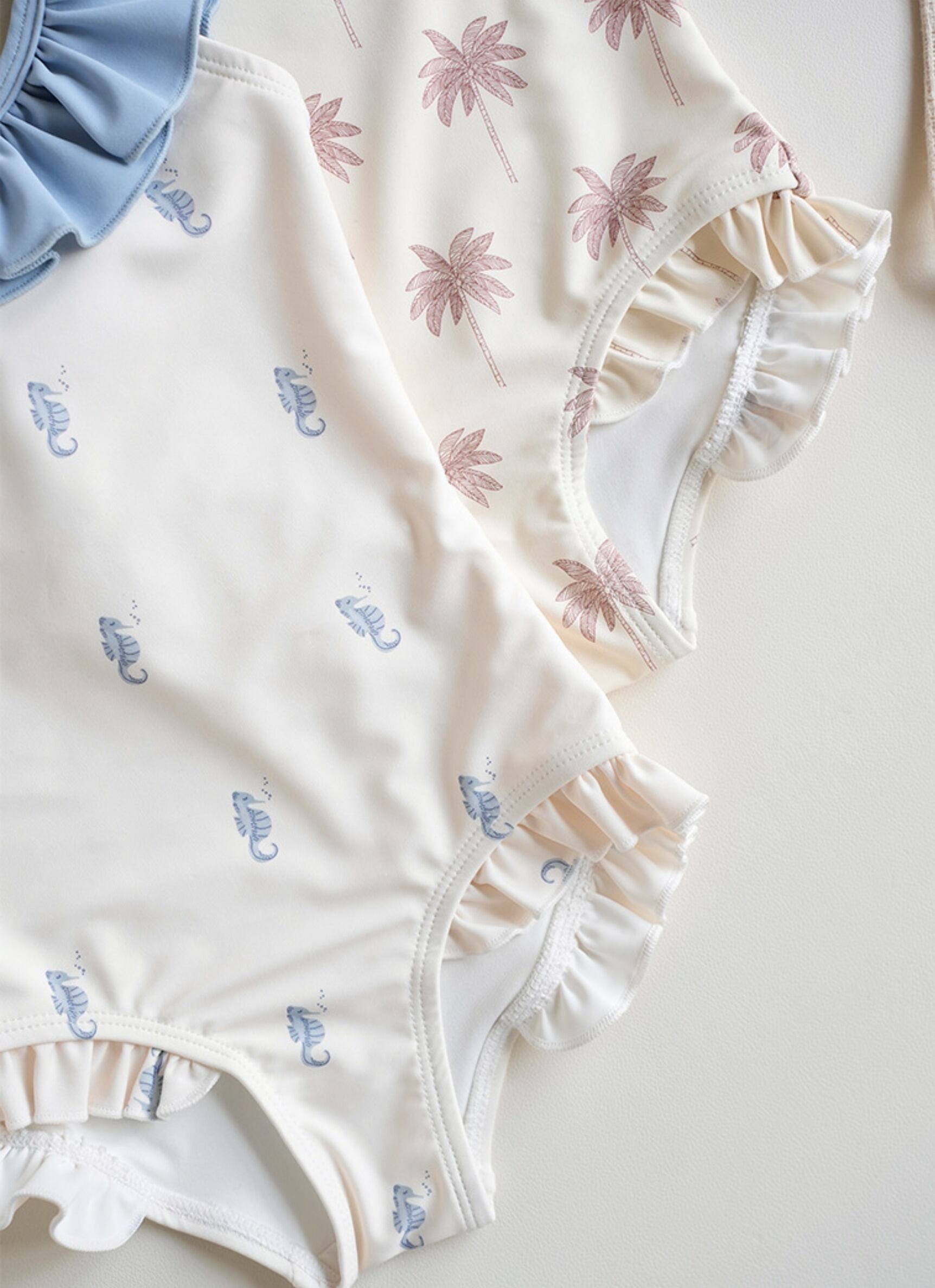 やさしいミルクカラーをベースに、それぞれ異なる柄をあしらったキッズ水着。
