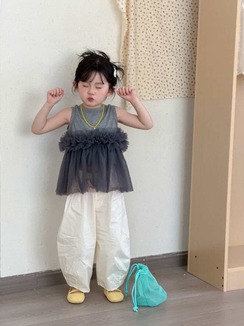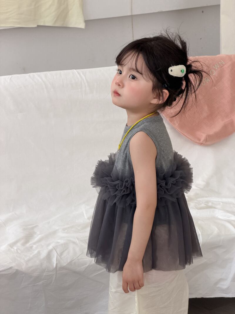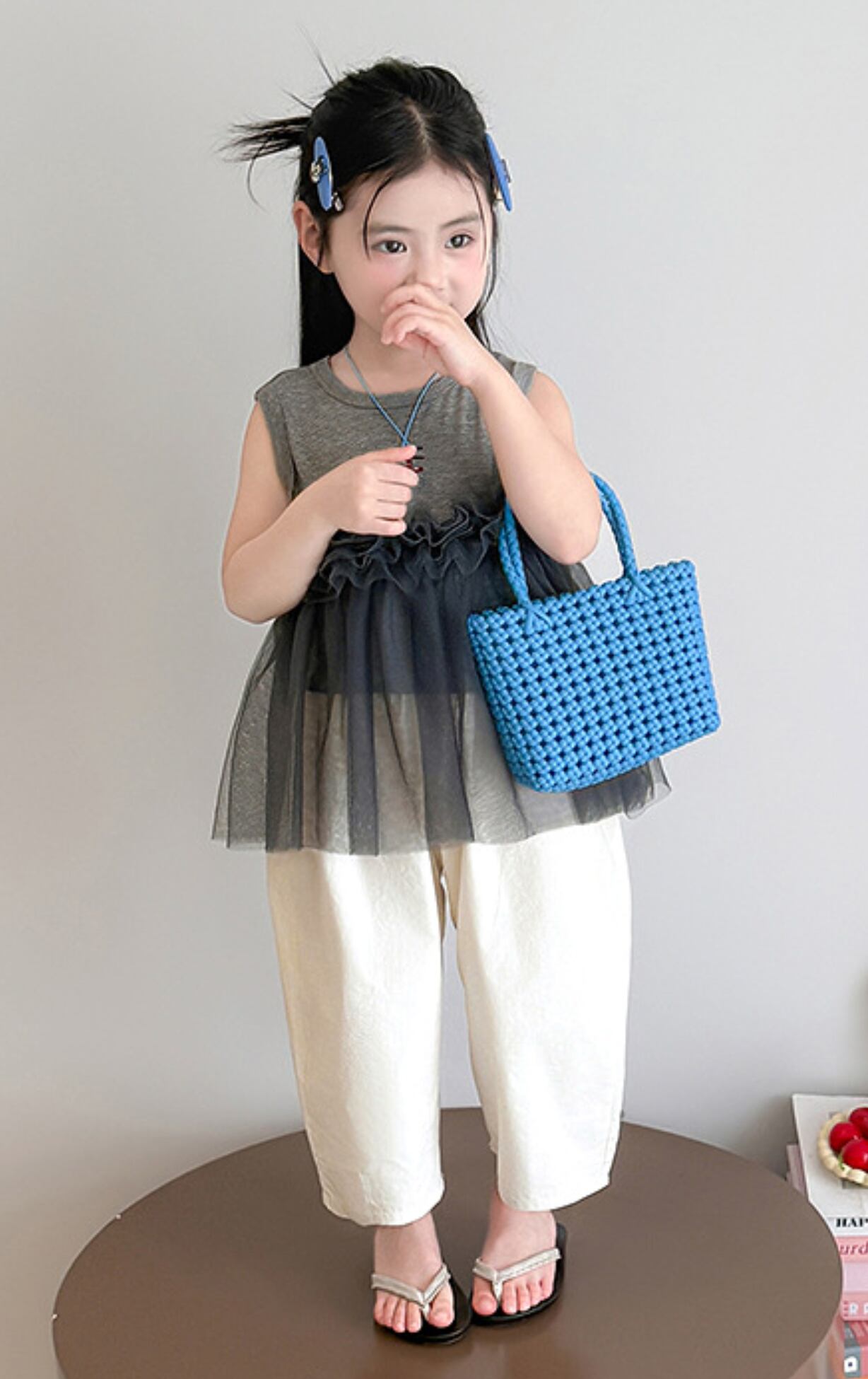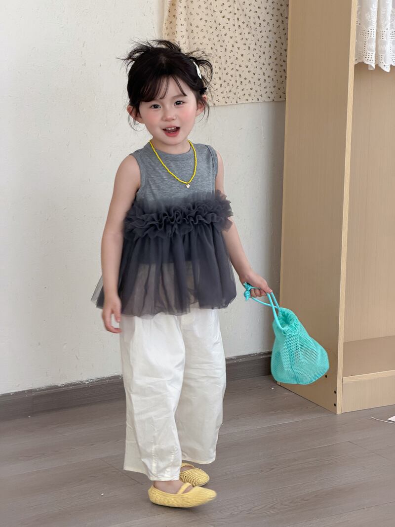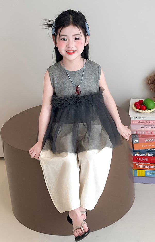肌触りやさしいニット素材に、ふんわりチュールメッシュの裾切り替えがアクセントの韓国子供服タンク。